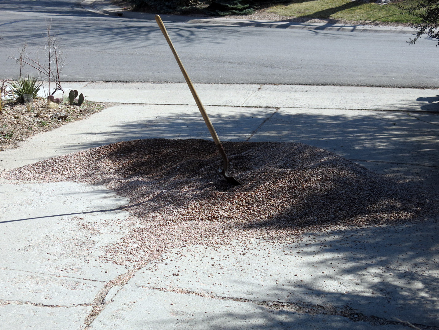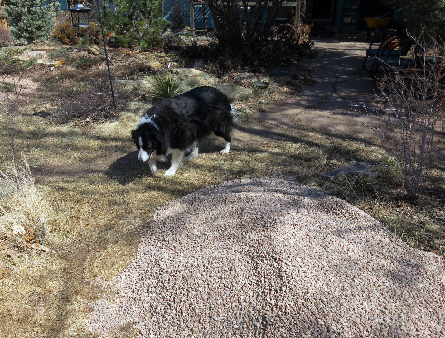 “His work?” you say? Why yes, the guy I live with had a bunch of pea gravel delivered this morning, after our walk.