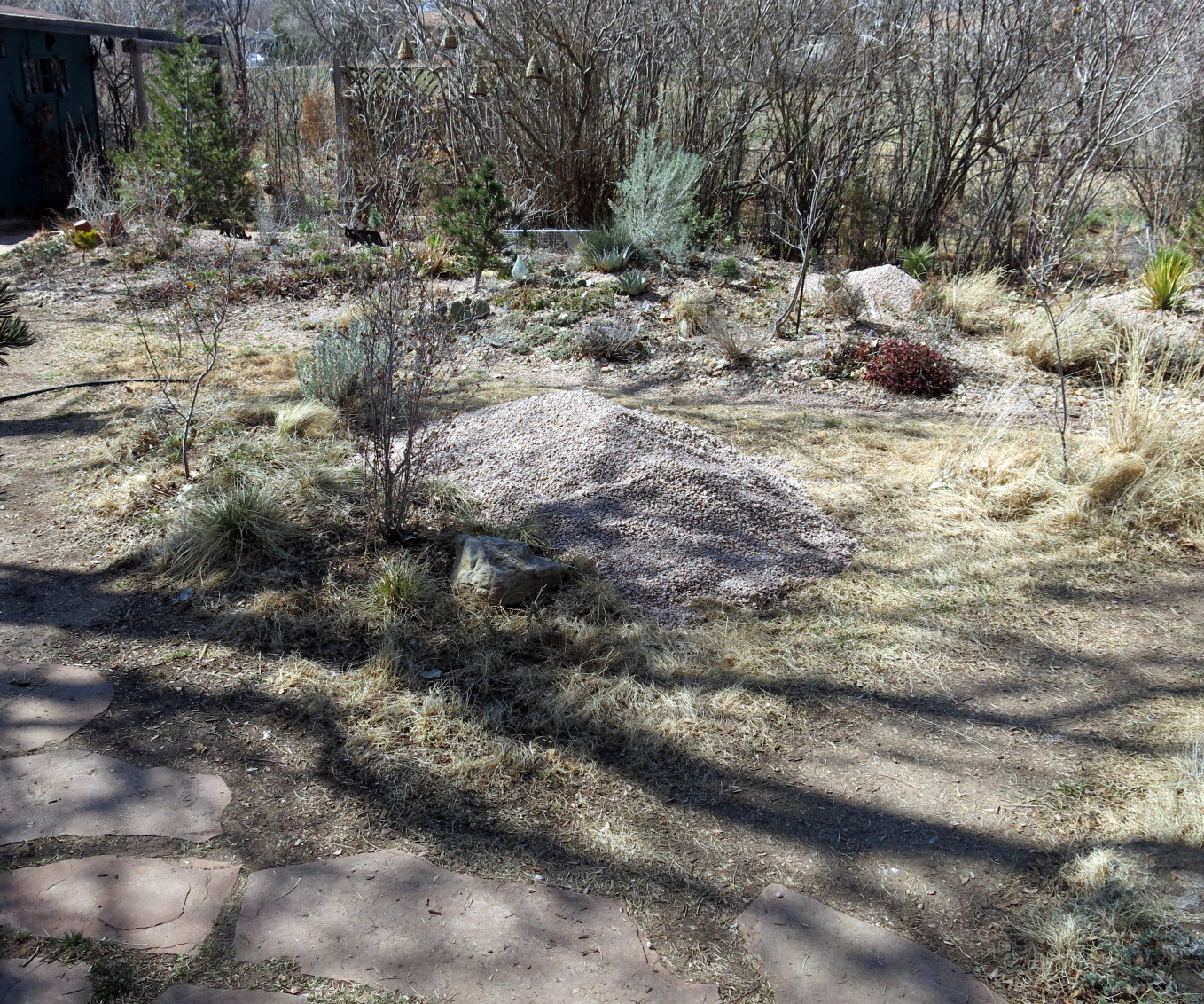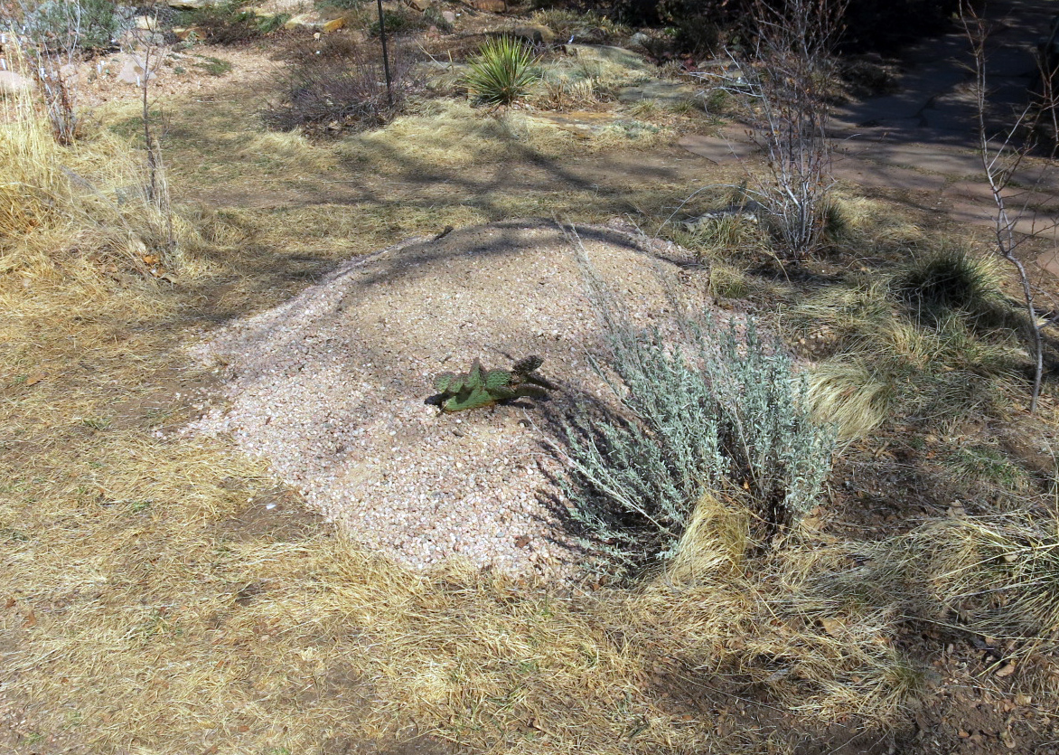 Well, no……this is a new thing. The soil in the front yard is this gross clay subsoil trucked in from somewhere else, after the house was built, as backfill, but it’s been dug in so much that the layer of clay has become reasonably permeable, down to the native soil, which is decomposed sandstone (from the Fountain Formation, like Red Rocks, Garden of the Gods, etc.). In the back yard, the same clay lies over the native soil, but it’s been so compacted, by border collie paws, etc., that it’s hopeless to dig in (consistency of ice cream right out of the freezer), so everything in the eastern half of the back yard is in raised beds. The news beds are pure sand and gravel because that’s closest to what desert plants grow in—highly oxygenated mineral soil with high permeability. Rain, and melting snow, goes right down to the roots. Clay soil holds more water than sand, of course, but water binds to the clay particles, making it difficult for roots to pull the water away from the bound particles, and so, effectively, there is less water available for plants in a clay soil. With sand and gravel, even though it holds less water, all water becomes available to plant roots. (Cactus are a different situation; they have shallow roots, enabling them to grab water even if it only percolates a few millimeters into the soil.) It’s a vastly more water-efficient method of growing the plants I like to grow.