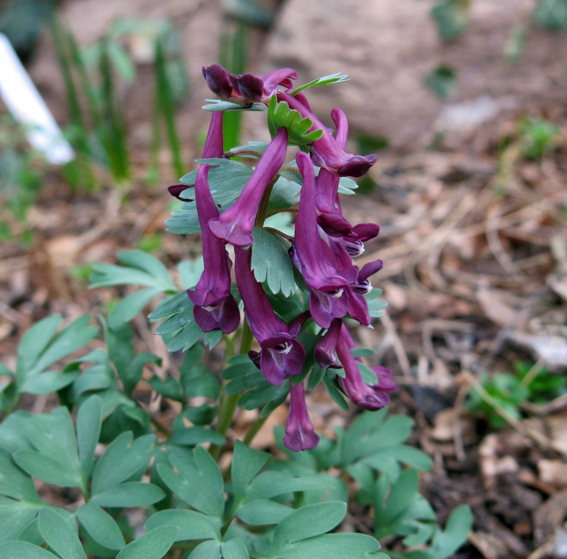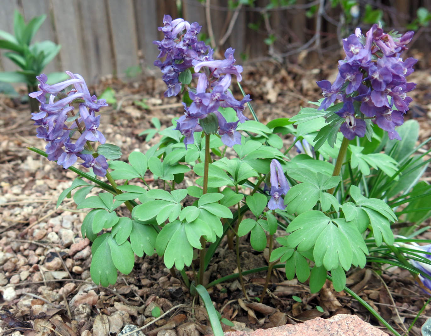 A couple of corydalis, too. Forms of Corydalis solida. He has to sit on the path in the south rock garden, which is called Mount Zot for very obscure reasons, to take these pictures.