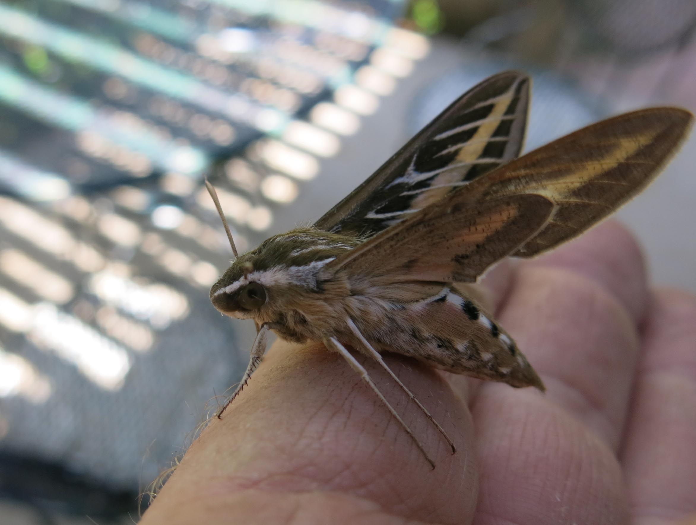 This is it. The white-lined sphinx, Hyles lineata. People say that’s what comes from tomato worms, but tomato worms make a much bigger moth, Manduca sexta or M. quinquemaculata.