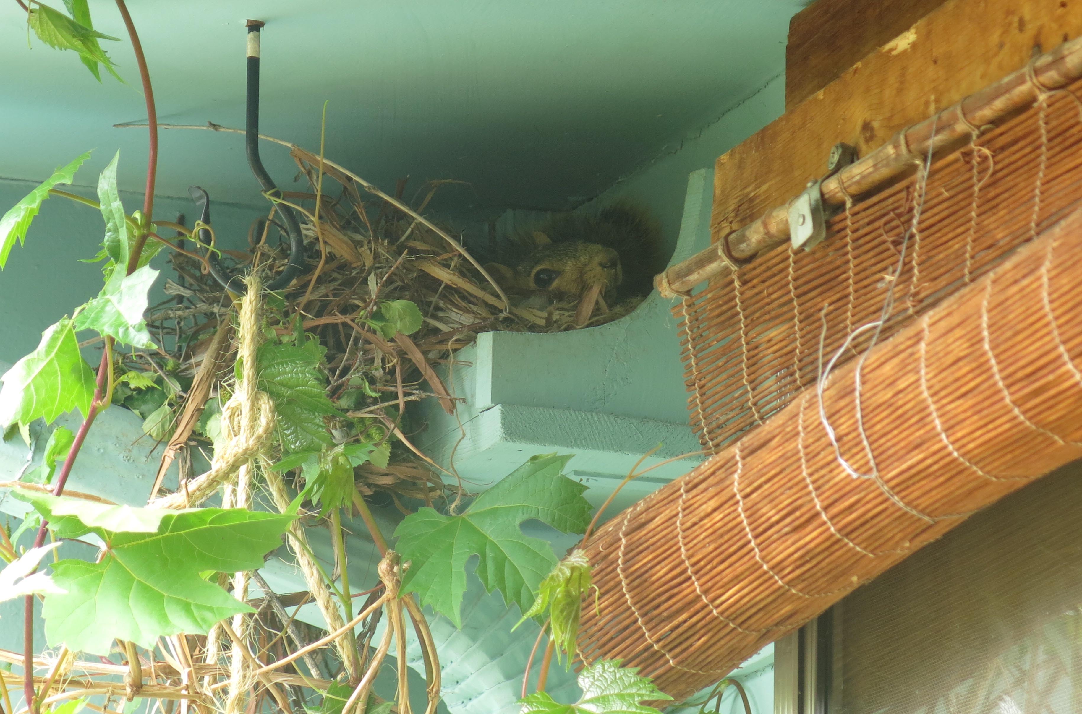 And, well, you remember Earl, the squirrel with the notch in his ear? The guy I live with said that Earl got married, and he’s going to be a daddy. The two squirrels found the nesting box my mommy made (for birds, though), back when it snowed, and then they took a bunch of twigs and shredded burlap and made a very cozy nest.
