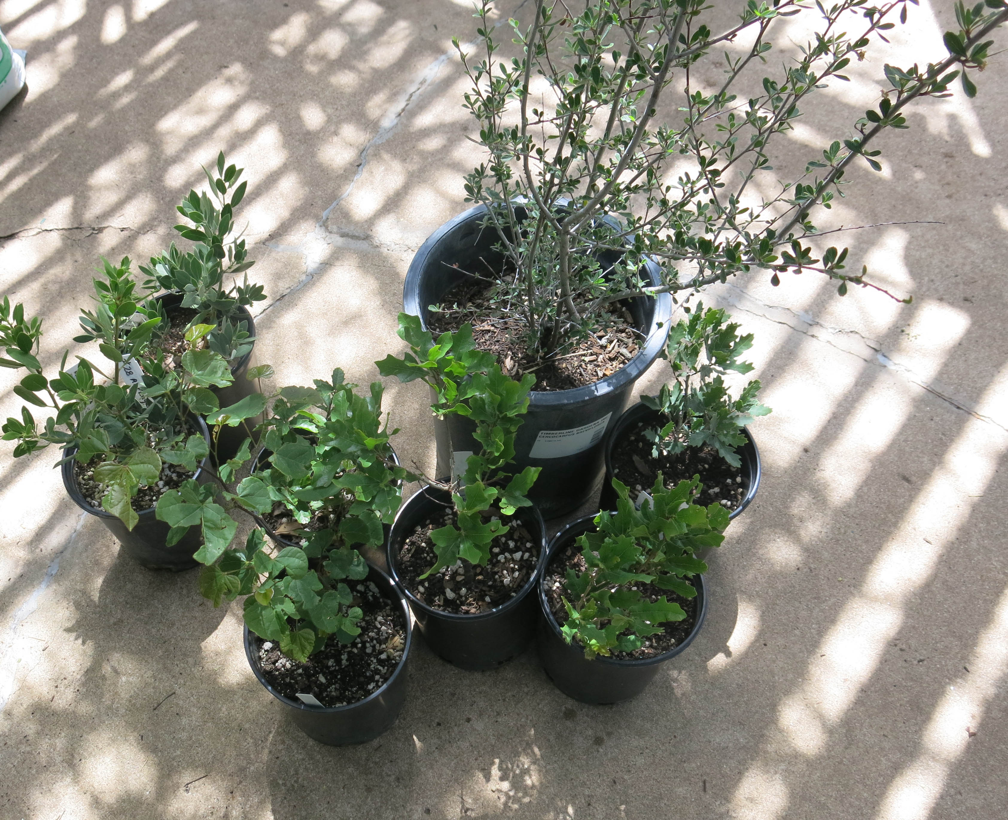 When my mommy was here, she would have asked, in a voice rather louder and more stern than usual, where exactly all these plants were supposed to go, since the garden is a bit full as it is. There are two manzanitas (Arctostaphylos pungens) on the left, four oaks (Quercus undulata), and a mountain mahogany (Cercocarpus breviflorus).