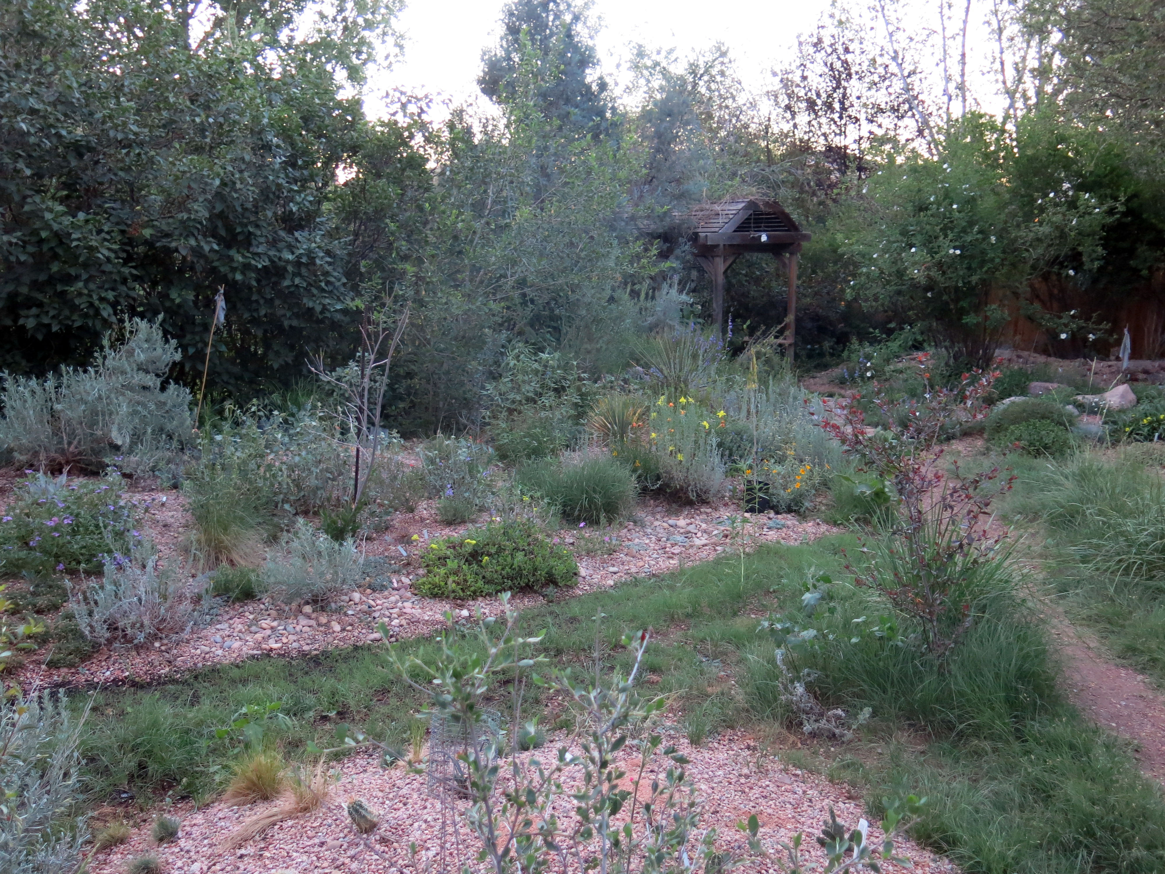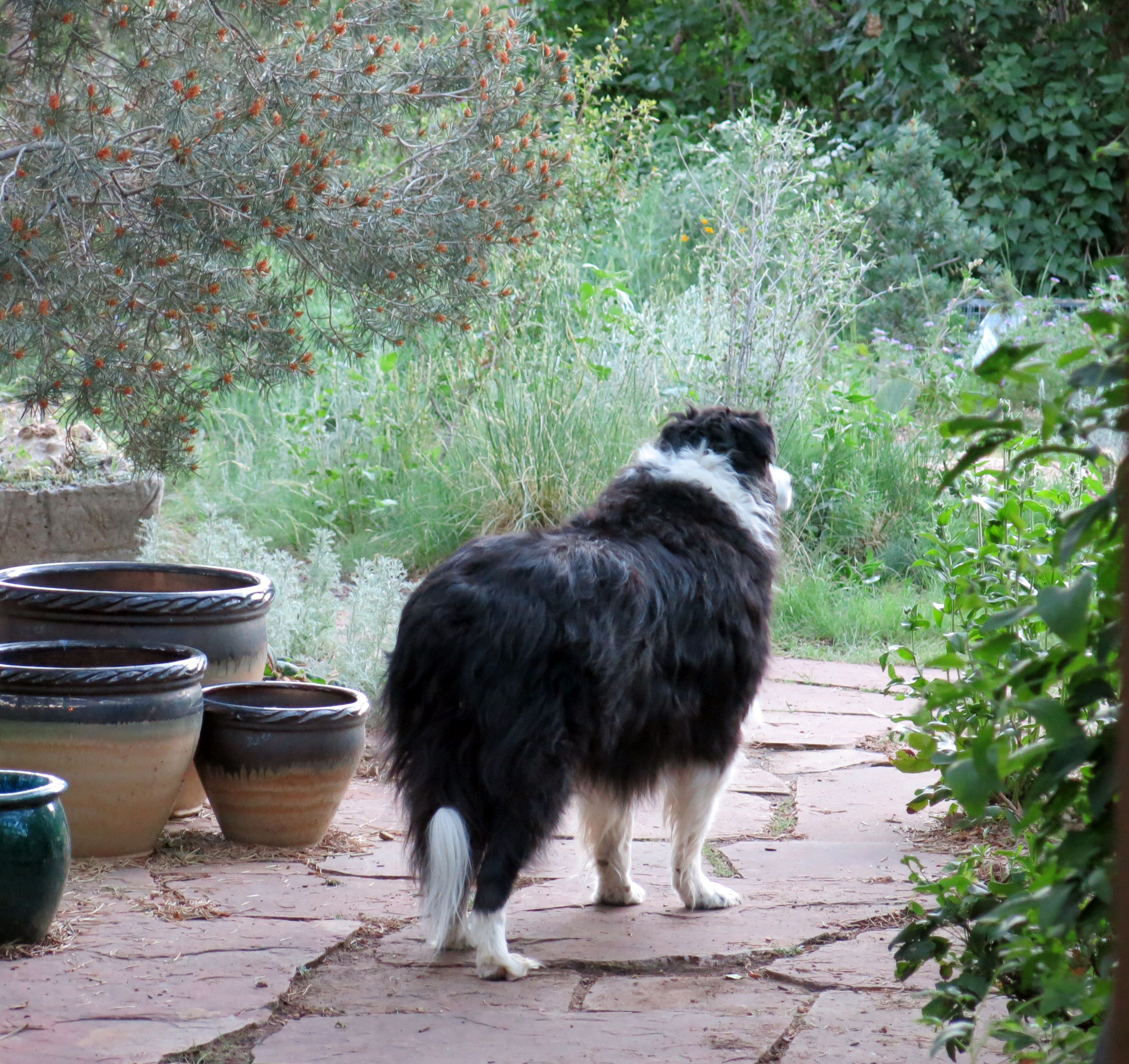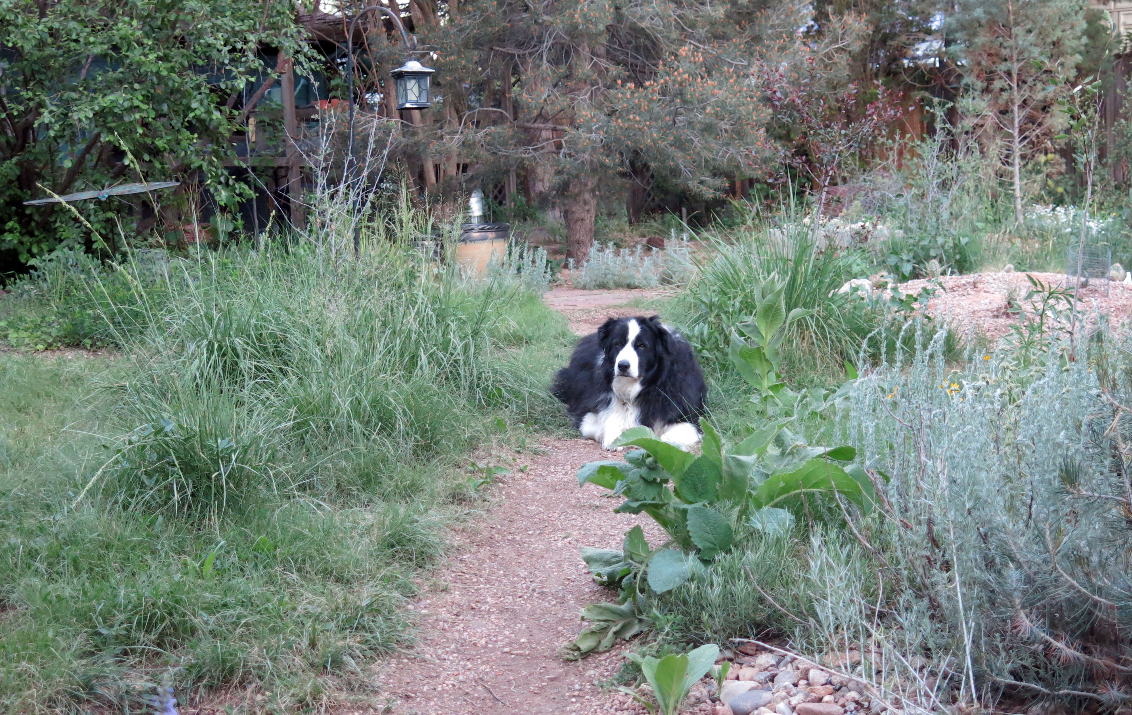 Chess, sometimes the way you lay out the photos of the guy you live with within the text pushes the words into poetry: Sentence left hanging, beautiful photo, mot juste. I tell you that to leave no thought unwritten before we ourselves push off for Winchester, England tomorrow. Hope we find poetry there. Another of my thoughts is most often the background makes the garden, and the garden sets off its background. True of your garden as shown in these photos. Border collies, pure bred or other, I would expect to prefer a rough patch of grass on which to lie to manicured. I am full of such thought today, thoughts such as the leafy green of calylophus sets off the colors of the yellow and orange flowers. Rosa kananica – from Southwest Asia! – is reported to have small flowers, but the ones on your plant seem large. Something in the non-water, perhaps. Moon shots are striking, and so silvery, and this for the “honey” moon named for its amber display. I love how the fore plants show so well and artsy and recede in dominance as the series progresses. You are fortunate to live in such a beauty spot, such a fitting setting for the proud, majestic – clean – dog on watch.