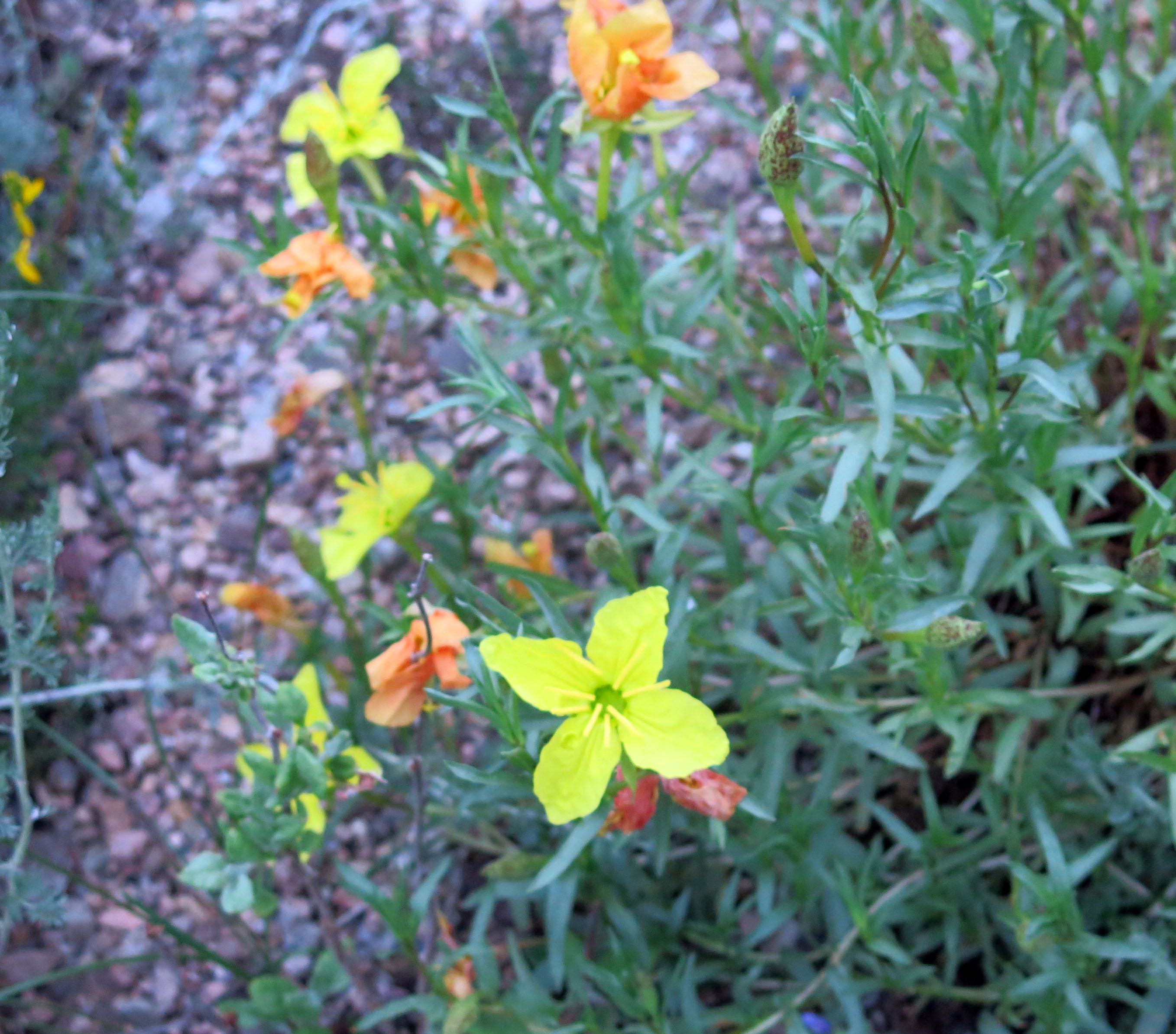 Let’s say this is Calylophus hartwegii. It’s a calylophus, anyway. If it were more in focus, you might be able to tell which species it really is, but the combination of fresh yellow flowers and orange spent ones is fairly attractive.