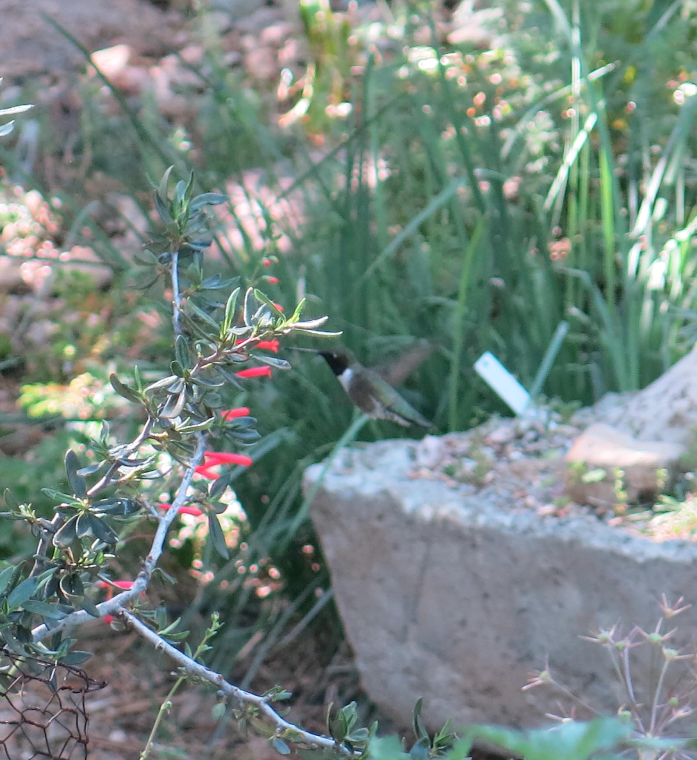 Anyway, the biggest deal besides me having to go for a ride is that the guy I live with says we have black-chinned hummingbirds now, and he got all excited when he was out with the camera and one flew to the Penstemon centranthifolius. This isn’t a really good black-chinned hummingbird picture, but it proves we have them. The guy I live with says this reminded him of “The Doubtful Guest” by Edward Gorey, but I guess you’ll have to judge for yourself.