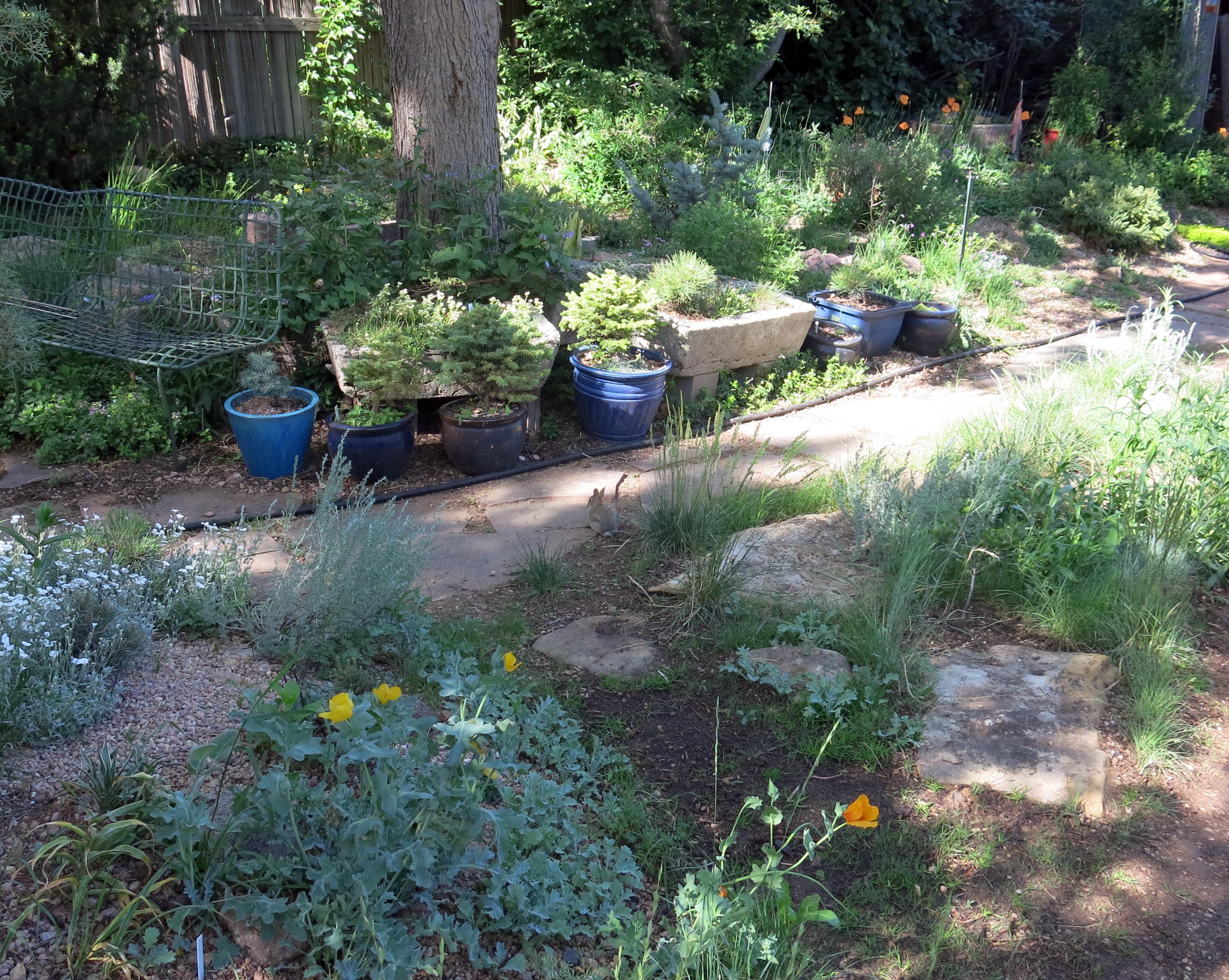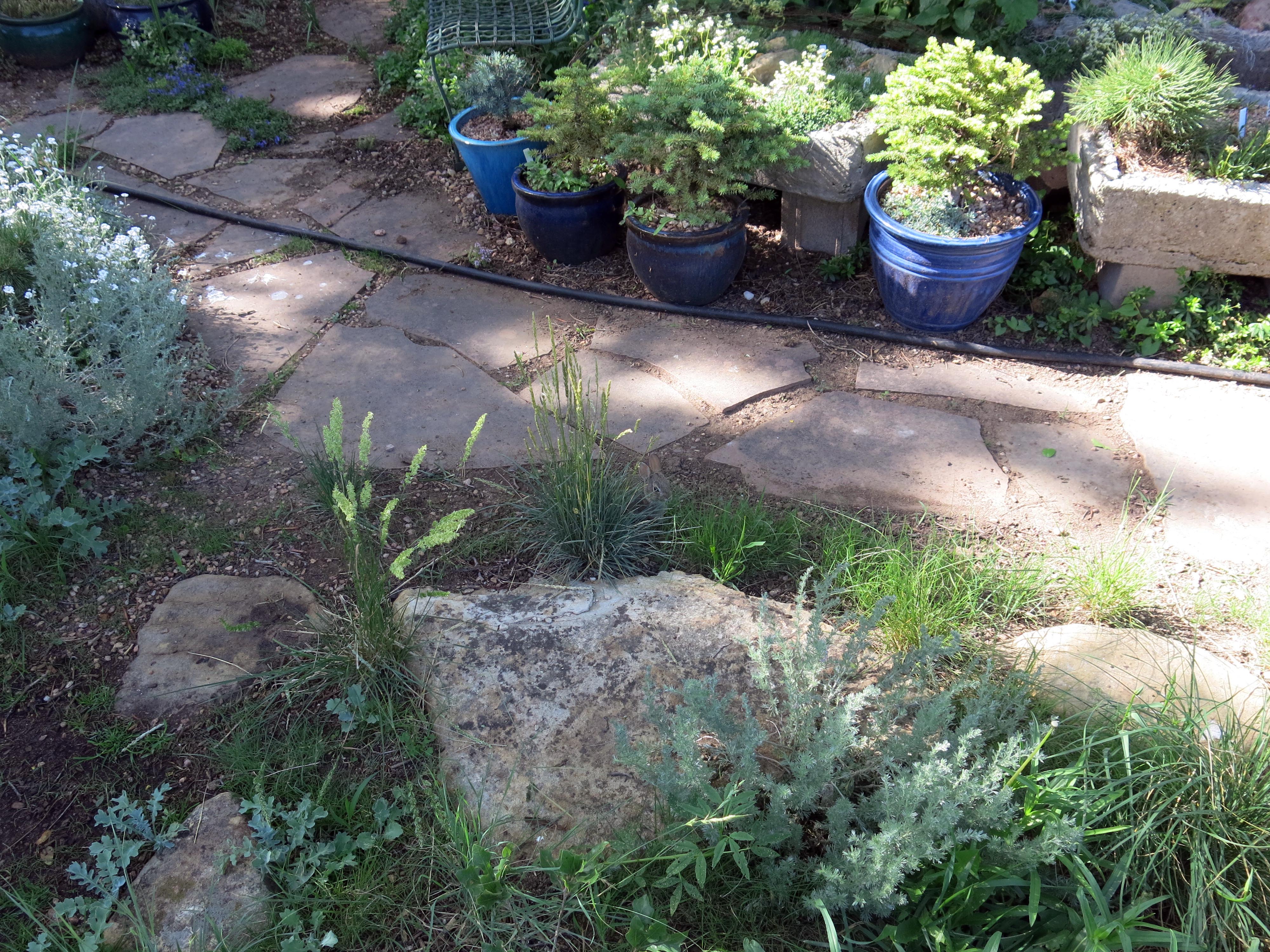 I think I have gone for a ride that didn’t end at the Bad Place, but I forget where I went. I’m on a different antibiotic now, because of the sore on my side. The foxtail is really bad this year, and the guy I live with says it’s because no one listens to him. (Well, can you blame them?) He says if people just let the grass grow, instead of mowing it “for looks” or “to keep down the weeds”, the grass (smooth brome)itself would fill in all the empty places, and actually keep down the weeds, and prevent foxtail from sowing itself everywhere. Cages are okay. Graham Stuart Thomas’s Trees in the Landscape (get the edition published by Jonathan Cape; it has more pictures), a book, by the way, which is not about trees in the garden, shows illustrations of tree guards used for centuries, so caging plants isn’t ungardeny. There are different varieties of buffalo grass for different parts of North America; check the Sharp Bros. or Stock Seed websites. Lots of info there. The seed comes treated with potassium nitrate, for quicker germination maybe, and it’s blue. Not really seed, but burs, with seed inside. You can also get “regular” buffalo grass seed, not treated, but germination is slow. Plugs are also possible. The lawnmowers will definitely enjoy munching on the plug tops, and the grass responds quickly.