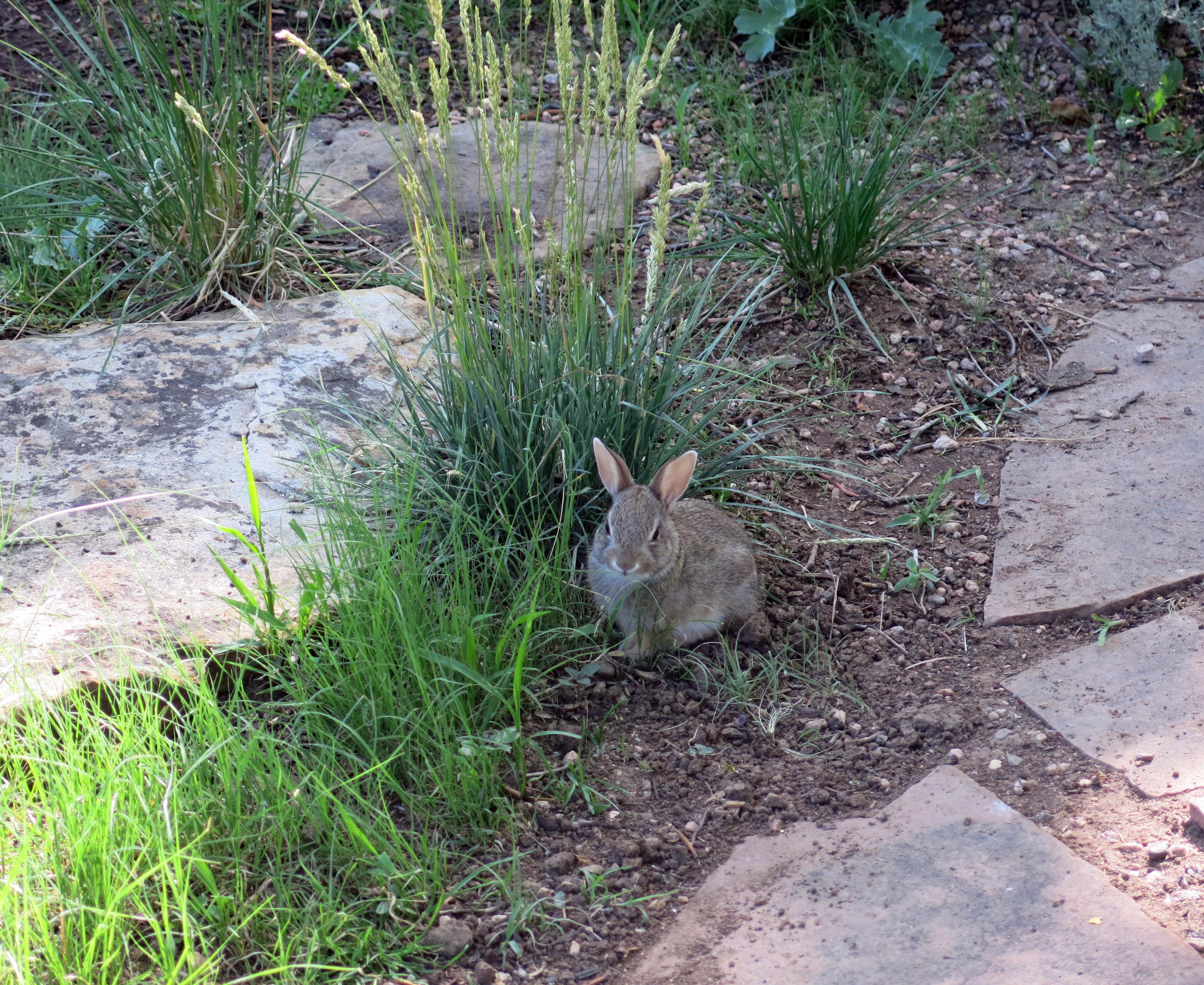 Doesn’t seem that the weather will get cooler here all next week, though they say high 70s for tomorrow, and that means a scary day for purebred border collies, maybe. The lawnmowers don’t do a huge amount of damage to plants we don’t want damaged, because so many of the plants are in cages. Oh, and a spray like Rabbit Stopper, smells like cinnamon, works quite well. Burrows are forbidden here. Burrows can be dug outside the fence, in very soft creek-bottom loam, and the grass is high enough that there’s plenty of cover; that’s the arrangement, in theory.