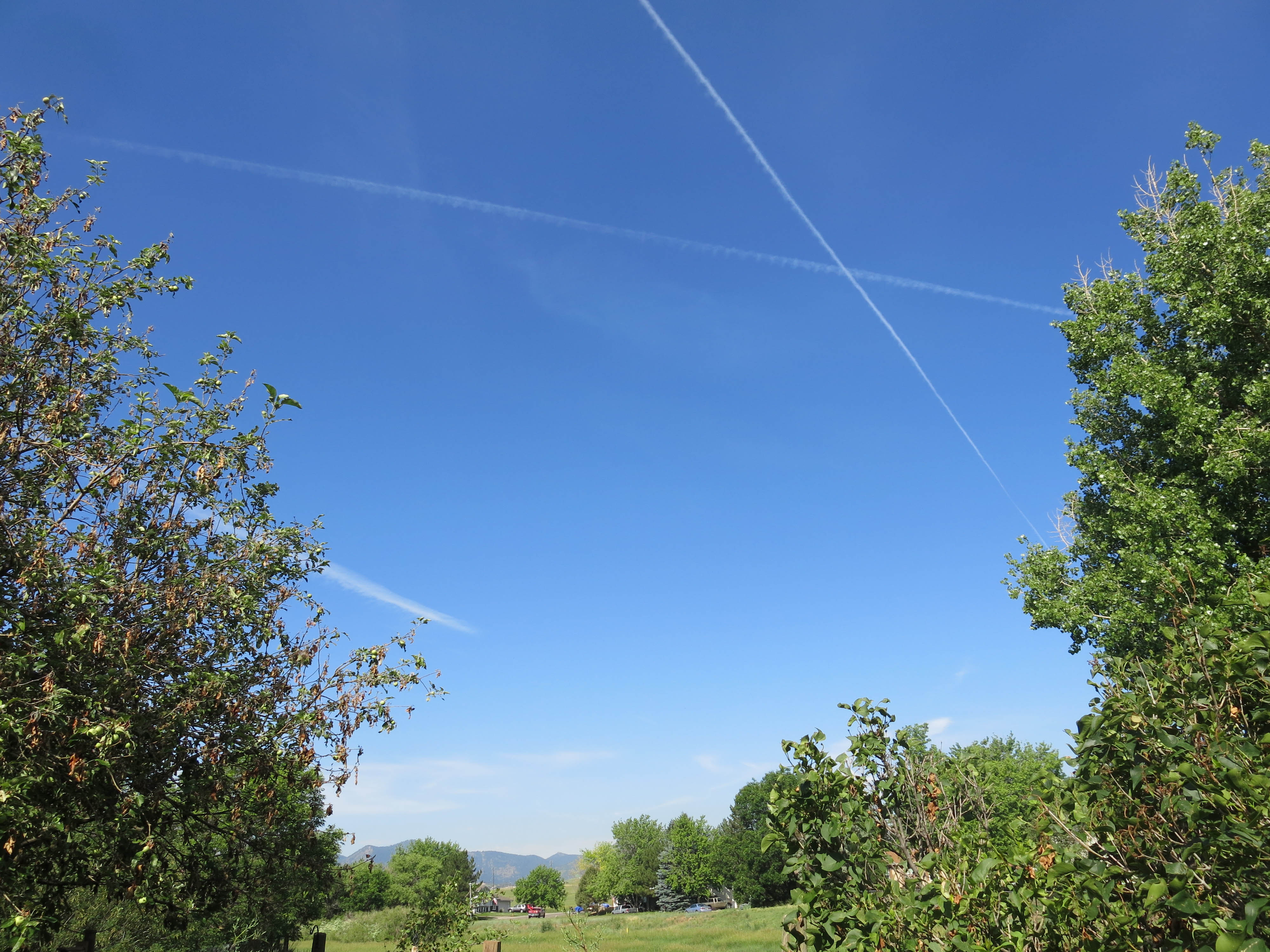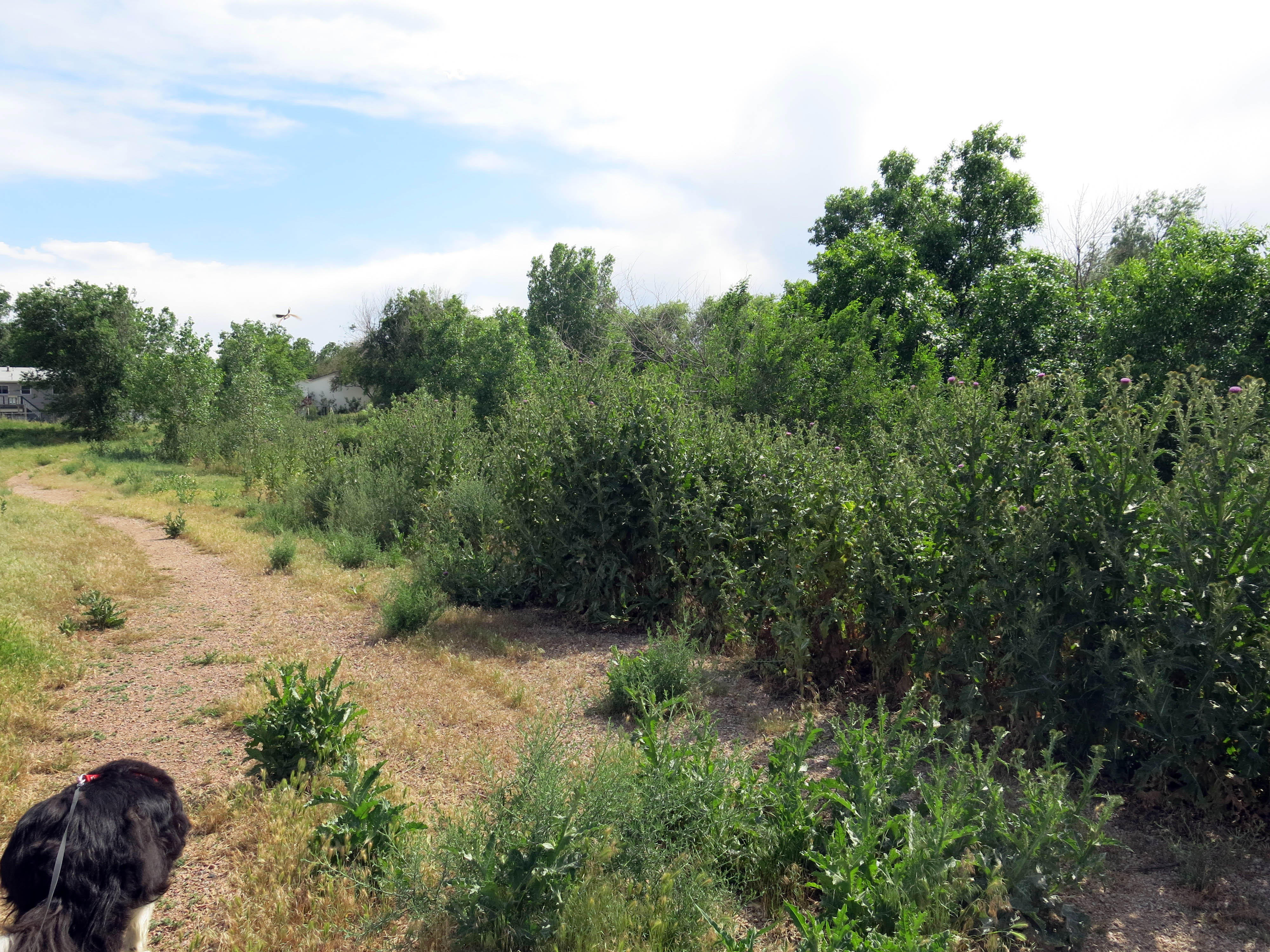 The only place here where the smooth brome has reached peoples’ back fences is at our house. Everywhere else it’s mowed, or sprayed (probably illegal), and the bare spaces are filled with weeds. Duh. (Not that smooth brome isn’t the ultimate weed.) We think that the last time there were native grasses here was in the early 1970s, when the neighborhood was built. Once smooth brome moves in, the end is near. But it does keep down other weeds. And everything else. Where the woods were, are now nothing but foxtail and cheatgrass, with the occasional blue grama tuft. There are some trees, pinyons, etc. too. A company came in and laid a drip system (for unknown reasons), and that was torn apart by dirtbikers years ago, but it’s still functioning, because you can hear gurgling and sputtering in places where there are no trees. They also planted hundreds of native wetland plants north of the canal, along the creek bed, and then walked away from the planting. All of the plants died because they never got watered. There are some interesting living native plants here, like Populus balsamifera, balsam poplar or hackmatack, a tree of Canada, but according to Weber also found in montane and subalpine areas here, though uncommon. There were a few trees right where the creek goes under US 285, but when the wooded area north of us was bulldozed, all the cottonwoods were removed. They’ve come back in force, and so has the balsam poplar. You can smell it long before you approach it. Very pleasant. How it got there is anyone’s guess.