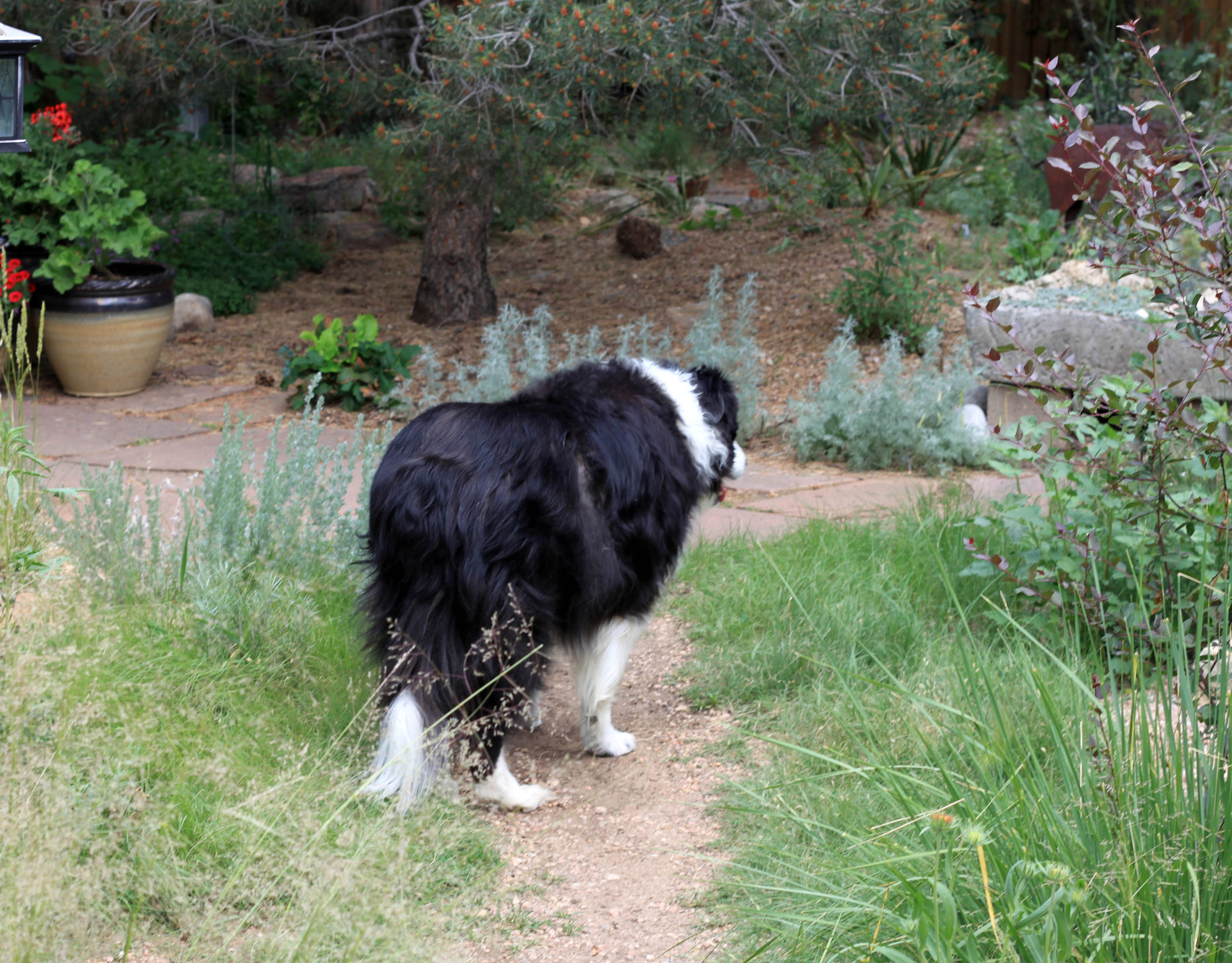 In other news, here I am in the garden. I don’t know what it was that I was looking at; maybe nothing. You can see the spot on my right side where I think a foxtail awn stuck in me. I get checked for them constantly, but they’re sometimes hard to find. The purple thing you see on the right is a cross between the purple-leafed sand cherry and Prunus andersonii he got at the RMC-NARGS plant sale from Agua Fria Nursery. I guess the motto here is, “If it’s weird and different, we need it for the garden.” Purebred border collies excepted, of course.