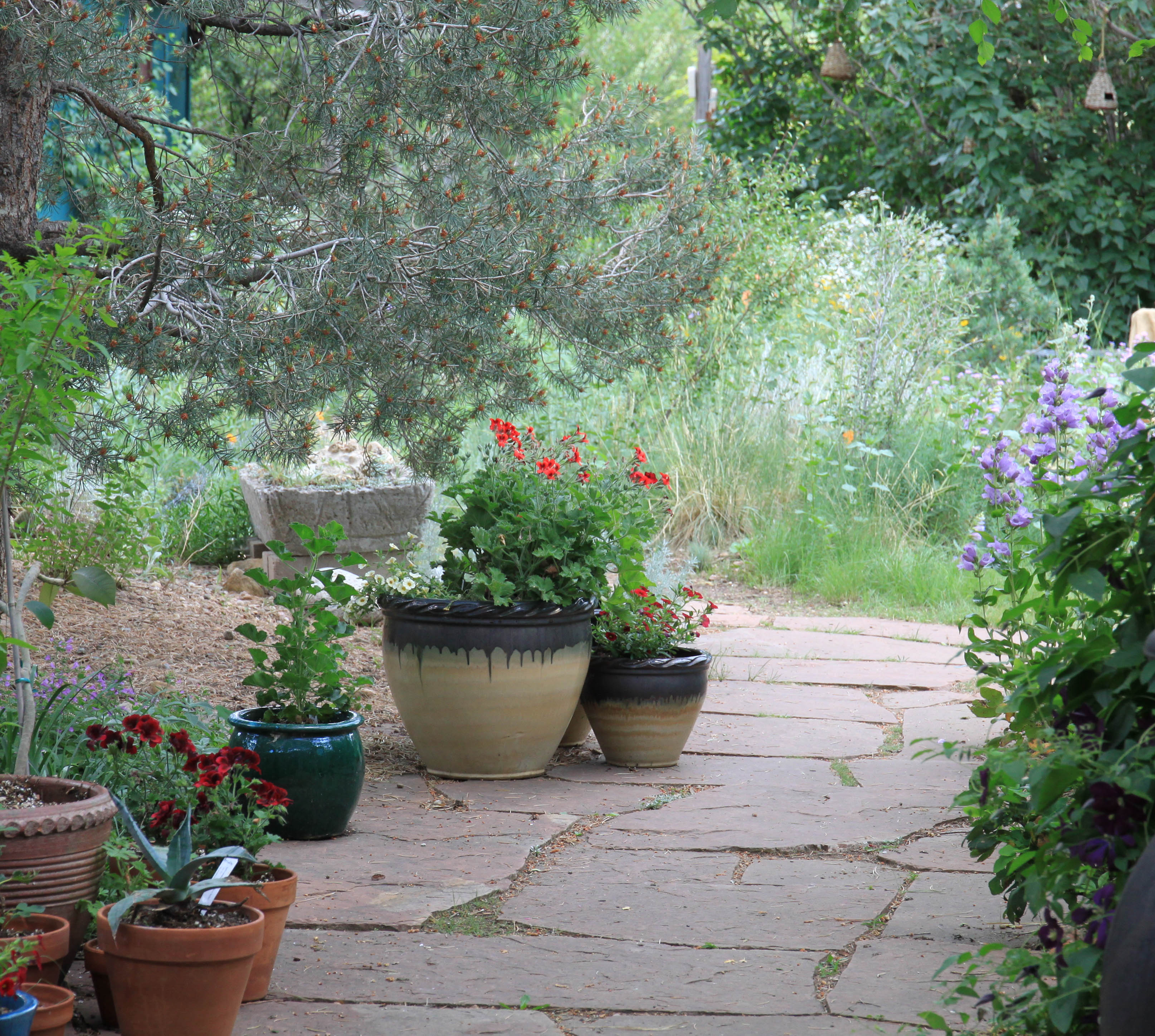 Anyway, here’s a shot of what it looks like if you were sitting at this chair. Notice that the pots have been planted with pelargoniums. The guy I live with says that makes us seem very continental. He picked these colors because he was told by the ladies at the paint store that he had no color sense at all, and so he said dark red might make the garden look less gray and drab. Penstemon cobaea on the right. He says “gray and drab” is what a garden should look like here. He says a lot of things, though.