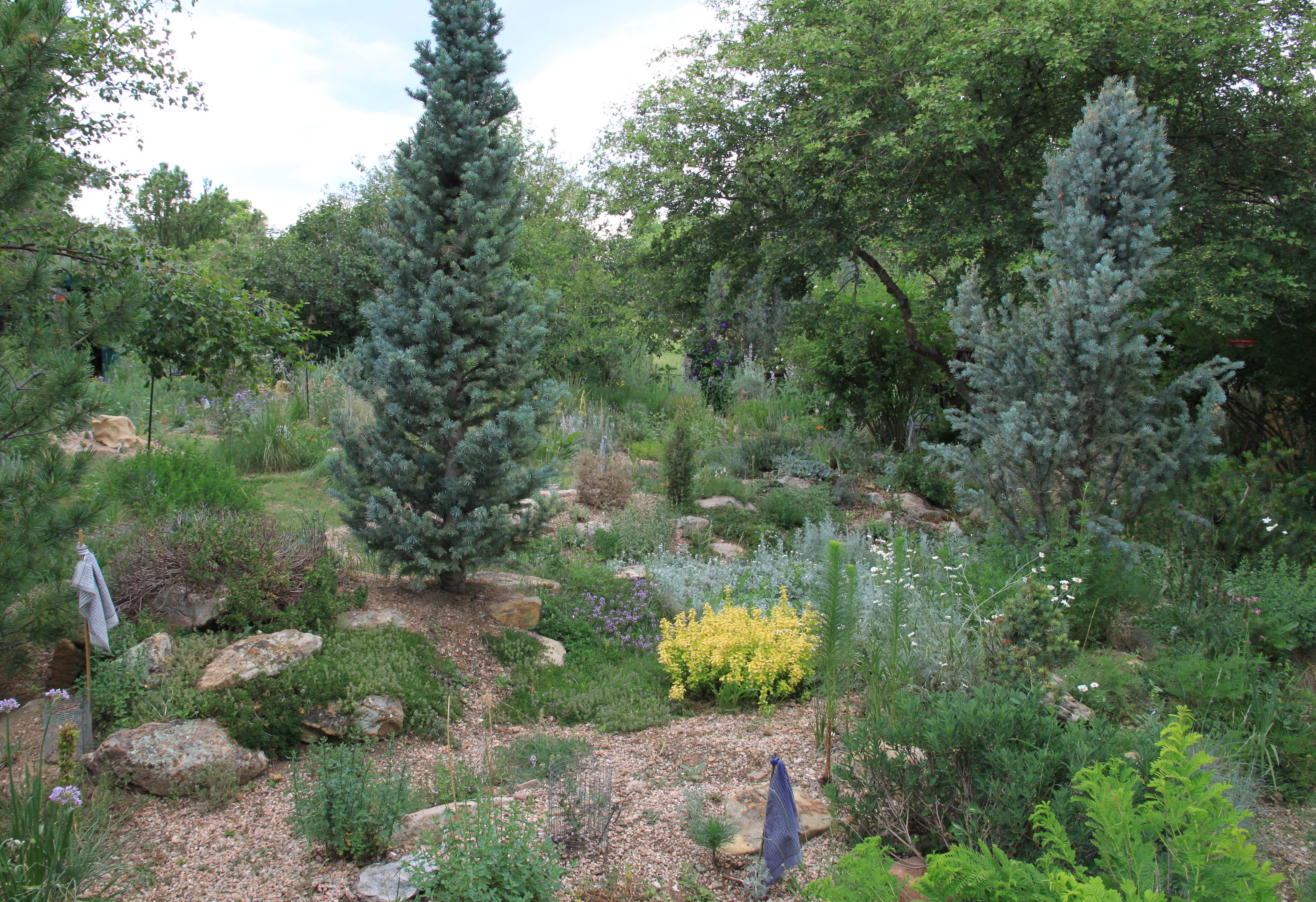 Next, looking over the rock gardens, facing more or less west. The prayer flags are old ones, and there to remind the guy I live with that there are new plants which need watering.