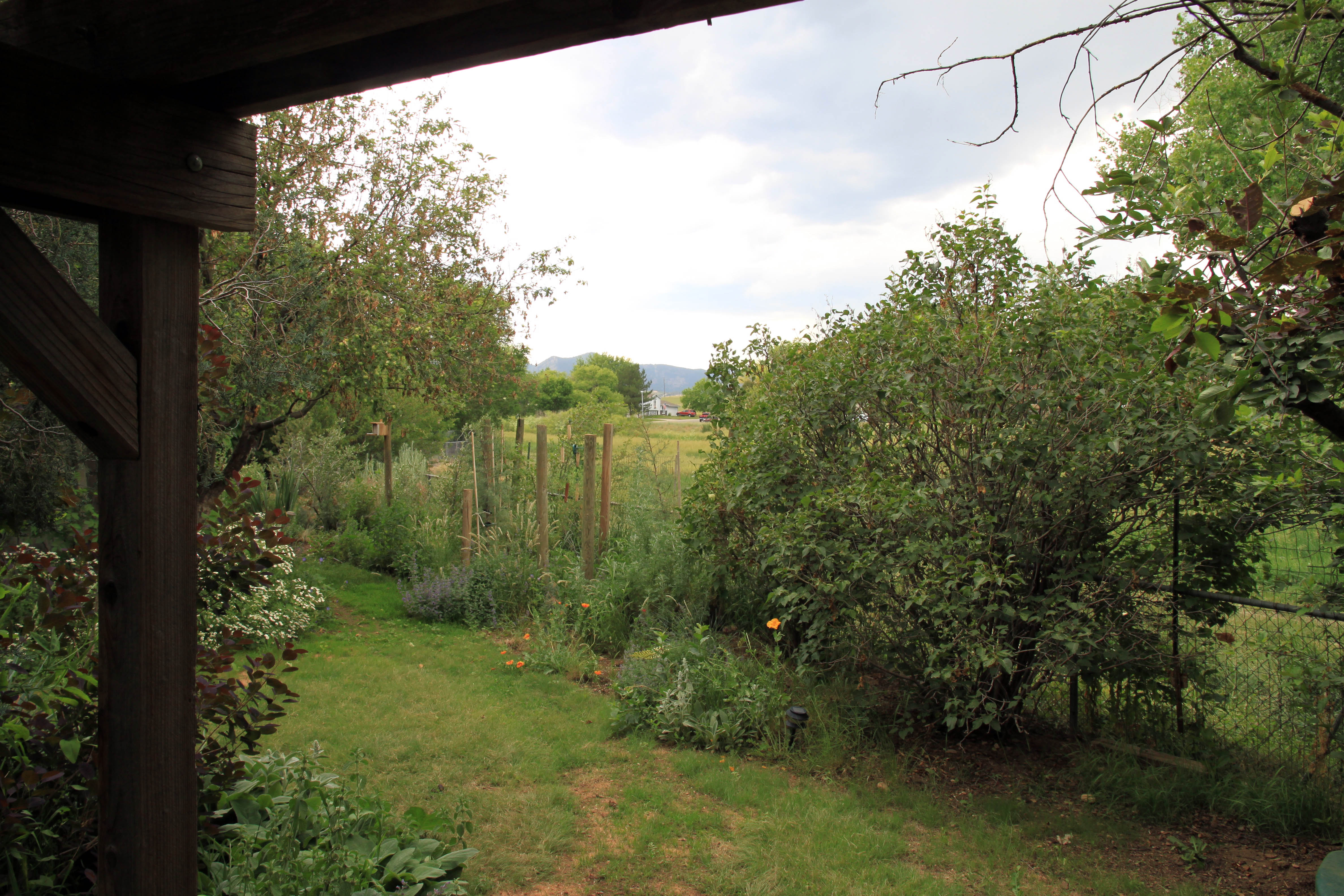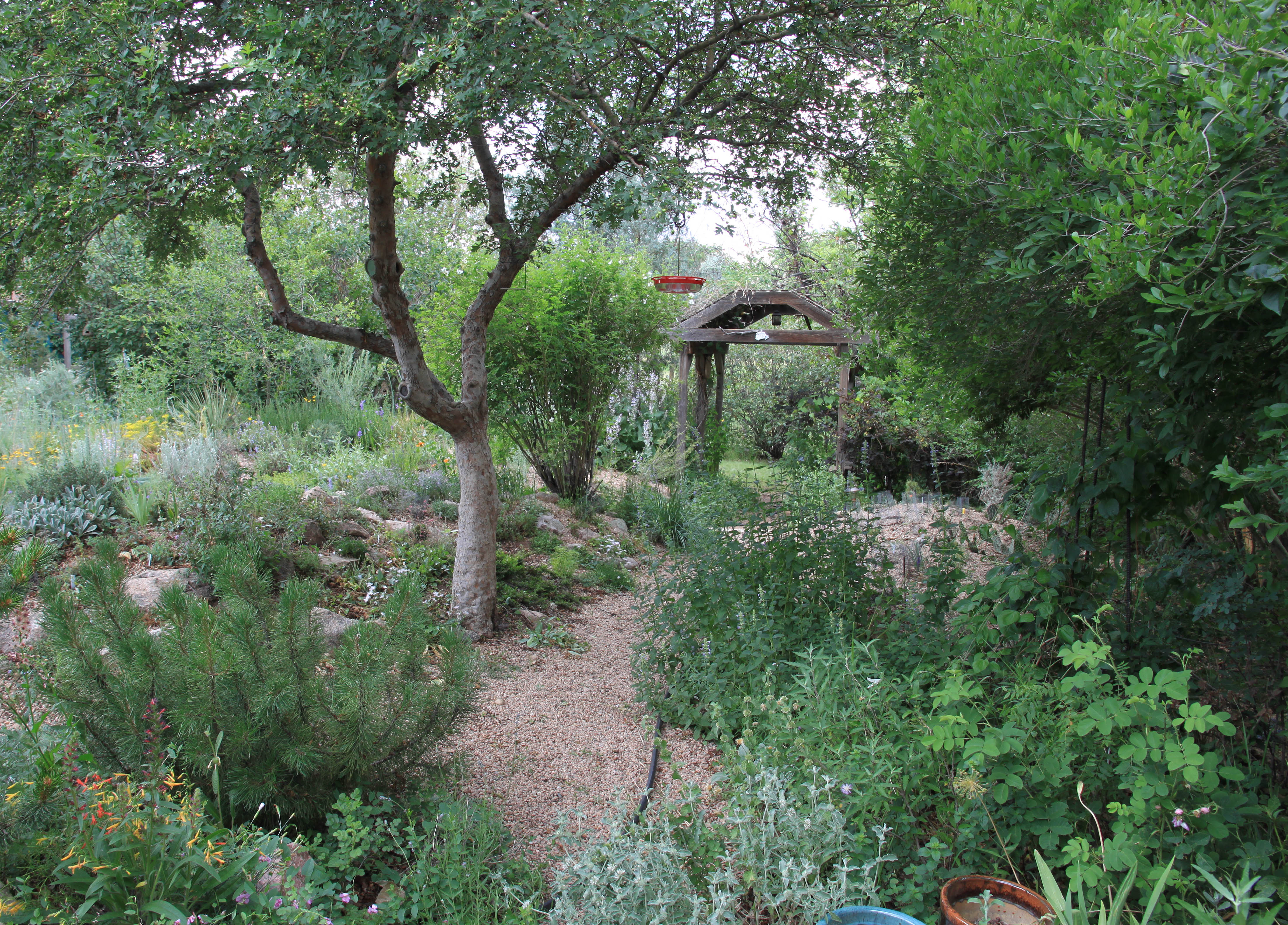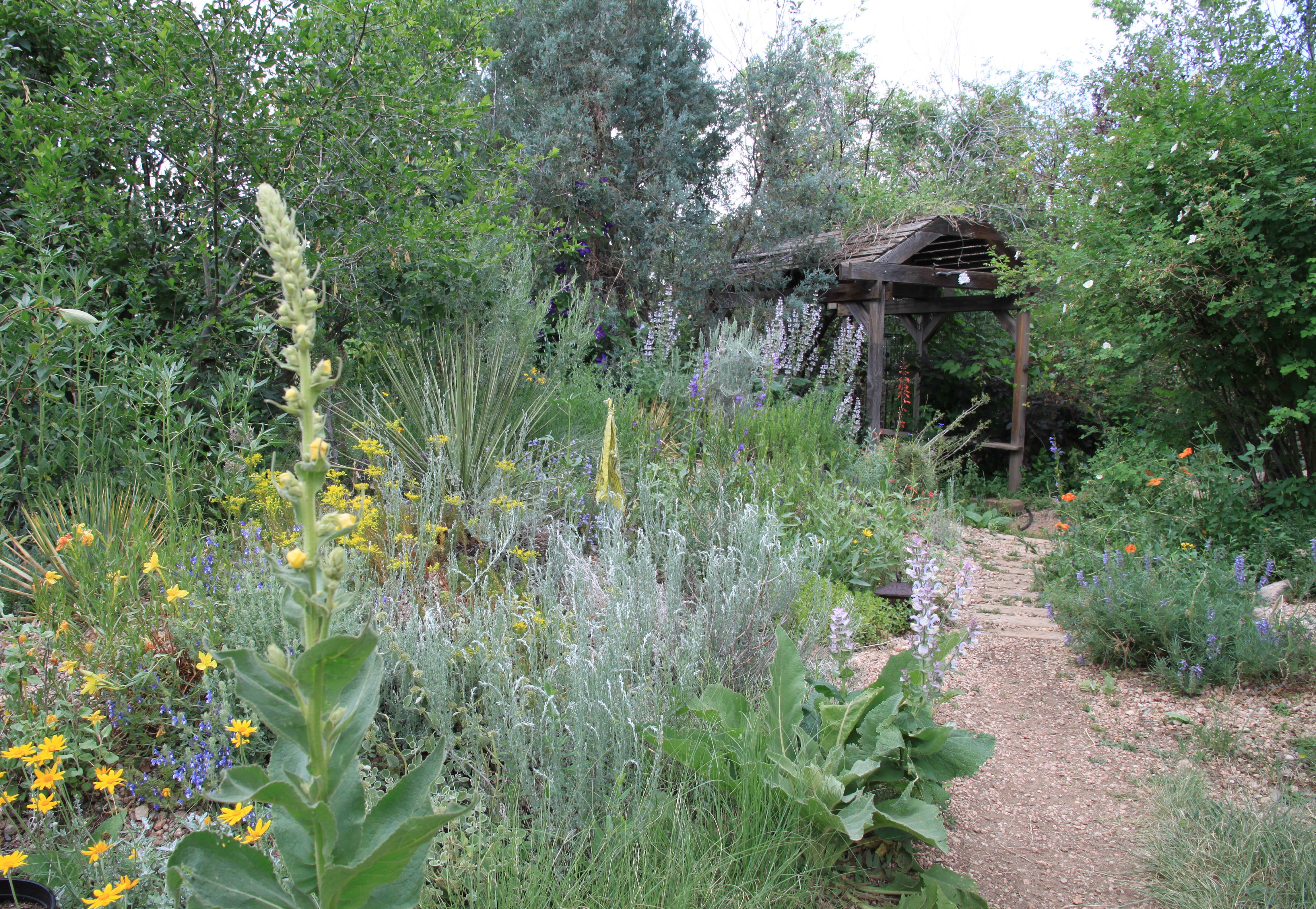 Looking at the same arbor from the middle of the garden. That’s Verbascum densiflorum right smack in front.