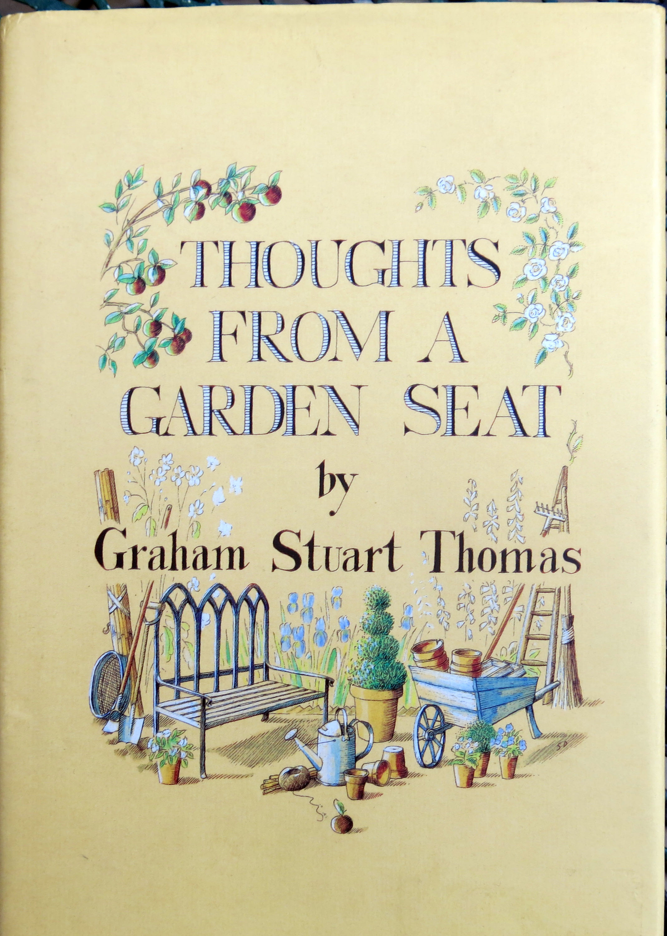 Dear sweet Chess, do not bother — although the first photo rebuts the notion of you bothered — about your readers worried by the prospect of a long post. Those are the especially finest kind, although short ones are excellent too. Question: what is the difference between a long hand spade and a trowel? Most of the objects pictured I would call trowels, true, but a couple are the kind of which I would ask my husband, “where did you leave the hand spade?” Great photo of little mousie stretching for a drink. Mice must consider your garden, Chess, a jungle wonderland. When we toured Mottisfond Abby rose garden, David Stone, head gardener for GST, pointed out Thomas’ favorite garden seat, a bench under a thatched roof in a corner of the garden. He also told a poignant story of GST’s last visit which occurred at the height of the rose bloom, all the roses he spent his life collecting looking splendidly in the garden he created. GST sat in his garden seat looking a long, long time.