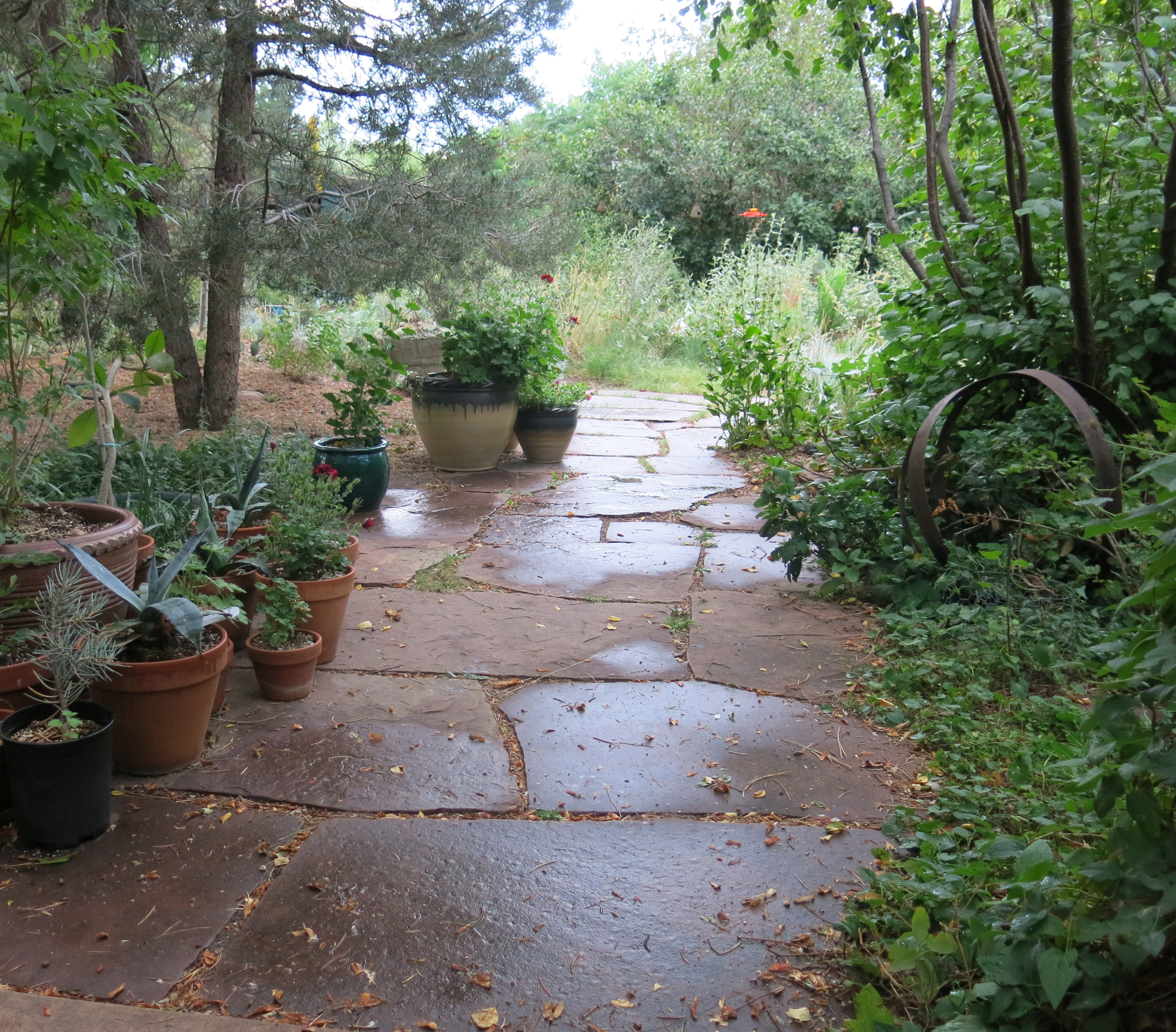 Thanks; I wonder if they make earmuffs for dogs. I kind of doubt it. Earmuffs might make me looks less saintly, and a lot more ridiculous, though. (By the way, did you know that there’s a plant with “ridiculous” in its name? There is. Aristolochia ridicula.) If you embiggen the half-wet (or half-dry) flagstone picture you can see the orange half in the oriole feeder (surprisingly, no orioles there), and the hail damage on the agave leaves, and the now-gone calibrachoa where the squirrel sat on it. The plumeria (with the twist-tie on it; the guy I live with grew up with Twist-Ems and gets all warm and fuzzy just thinking about them) got a feed of epsom salts and “took off”. It’s never bloomed, though. Regular cleomes have never grown well here, grown from potted plants. We (well, mostly the guy I live with) suspect that it has a hard time getting its roots “right” in the short period it has to grow and then flower. The native cleome comes up from seed and its roots are right to begin with. It does seed all over the place, though. He says, and I have no reason to doubt him since this isn’t my area of expertise, that there are some plants, especially taprooted ones, that are very difficult to establish when grown in containers. Redbud is certainly one. The chocolate flower, Berlandiera lyrata, is another.