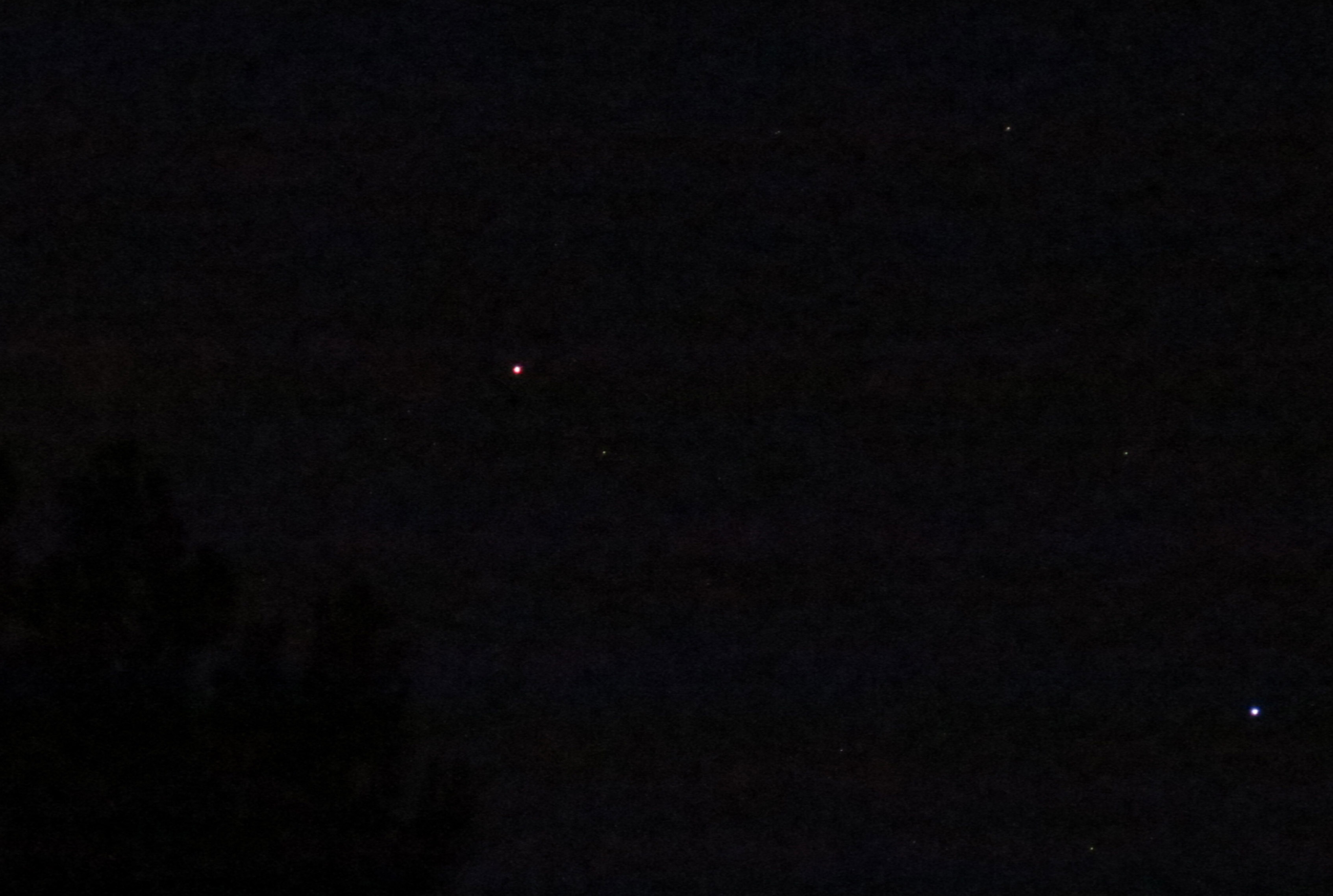 And here’s Mars. The red dot. The guy I live with says there are “people who walk among us” who are from that planet, or even planets much farther away. (That’s the star Spica in Virgo, in the lower right.)
