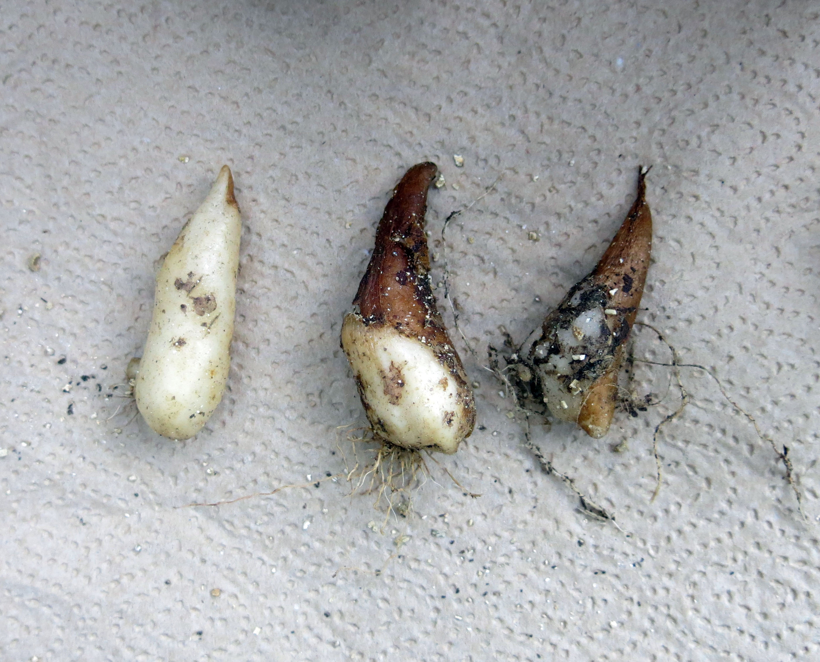 He also got some bulbs in the mail, and before planting them, took some pictures. He said that with erythroniums it helps to know which side is down, or up, depending on how you look at it. I suppose this is because he planted some upside-down last fall, and had to dig them up and replant them. These are shown right side up, he says.