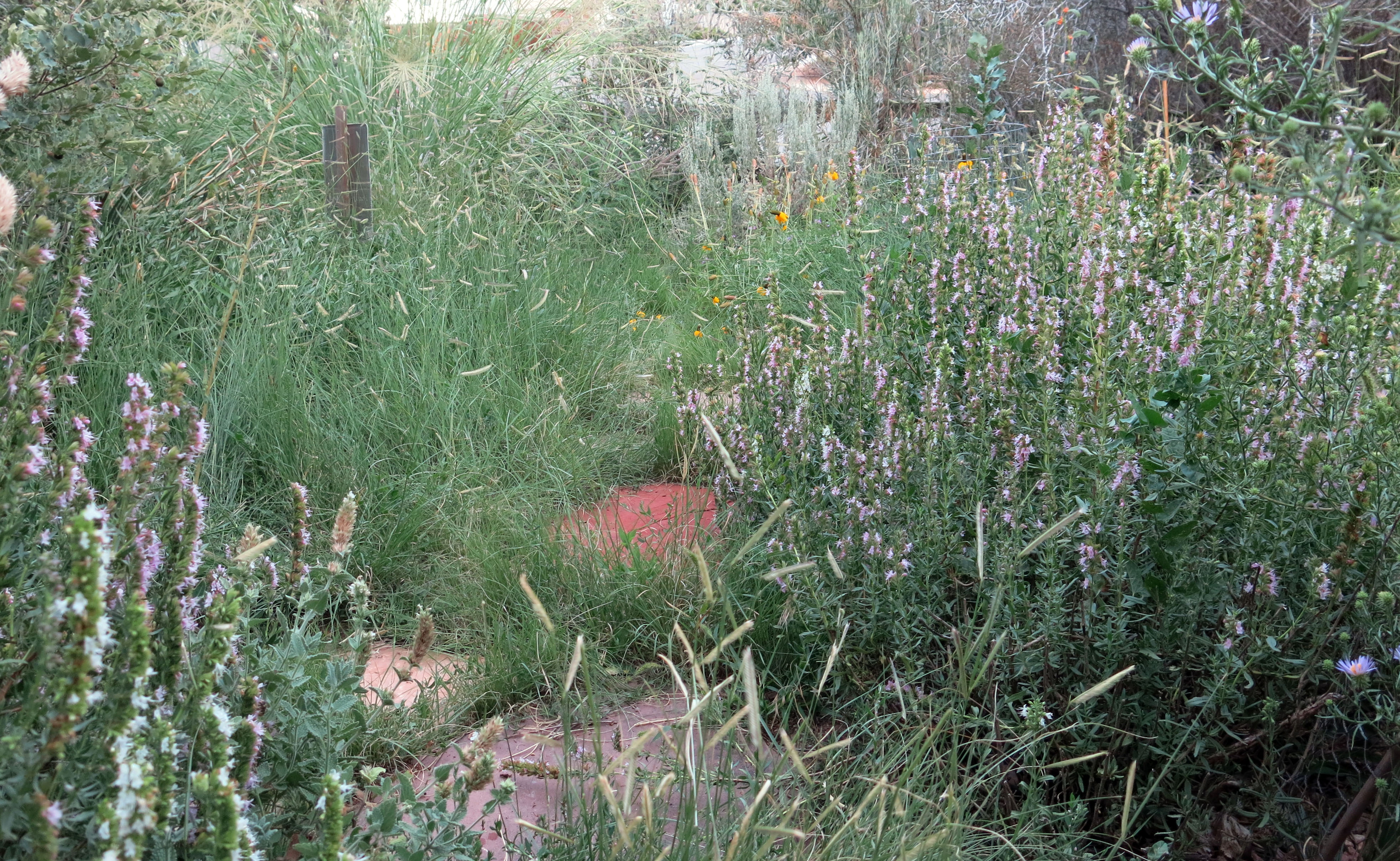 I thought I’d post a picture of our front lawn, to prove that we have one. I’ve shown pictures of it before, but now it’s “peaking”, according to the guy I live with. We have a lawn that peaks. He says the reddish flagstone “strikes a discordant note”. I think he gets that from reading a lot of Graham Stuart Thomas.