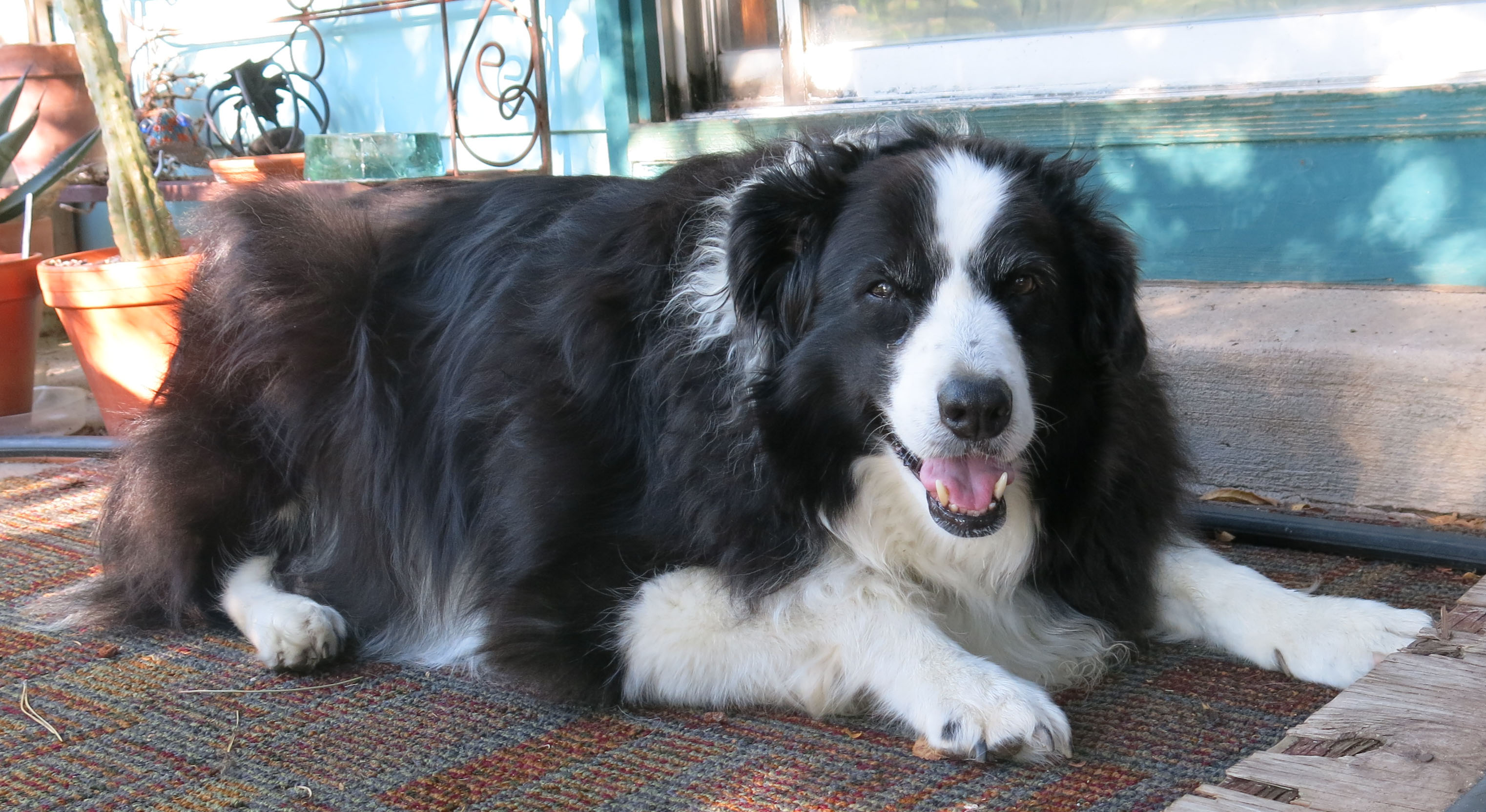 Here I am in a characteristic, but rare, pose. I know, “How can a pose be both characteristic and rare at the same time?” Well, it can be. “Characteristic” considering my life in general, but “rare” for this summer. I’m sitting out on the patio rug, in the sun (believe it or not), though the rug is soaking wet from yesterday’s rain. We purebred border collies are used to roughing it. This is me roughing it.