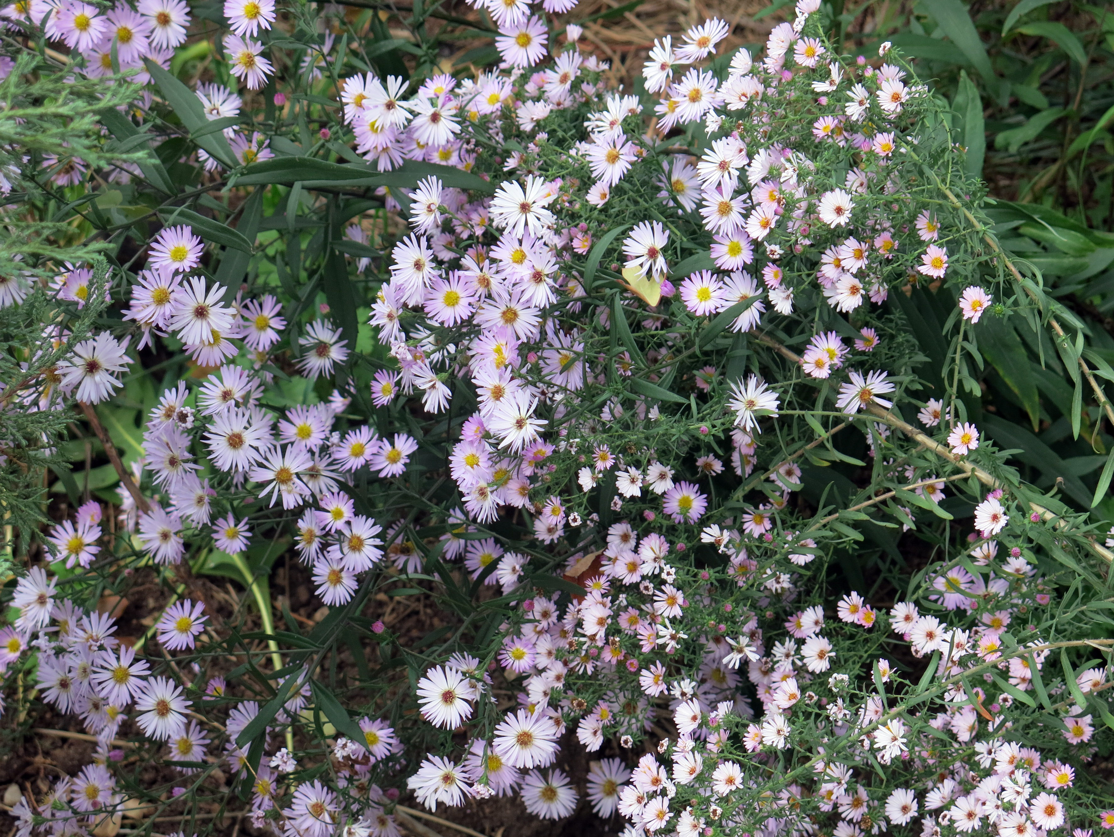 Internet is nice to have. When email first appeared, the guy I live with got a few friends that way, and my mommy saw how cool it was, and eventually wound up with a number of online friends whom she’d never met. The aster name changes are something else. We still say aster around here, because people might stare at us if we said symphyotrichum. Oh, by the way, the Aster ericoides isn’t Pink Cloud, it’s Ringdove.