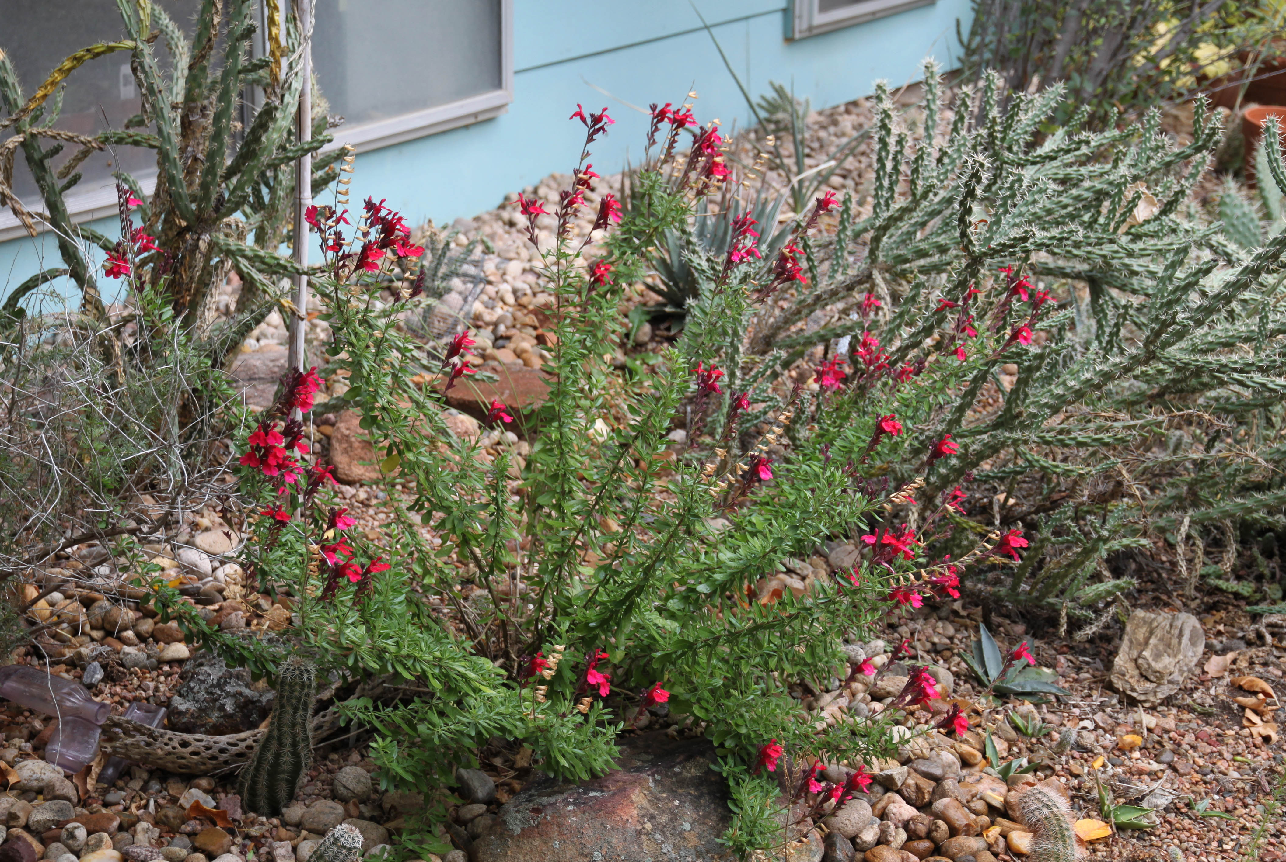 Various forms of Salvia greggii are still in full bloom. I think this one is ‘Cold Hardy Pink’.