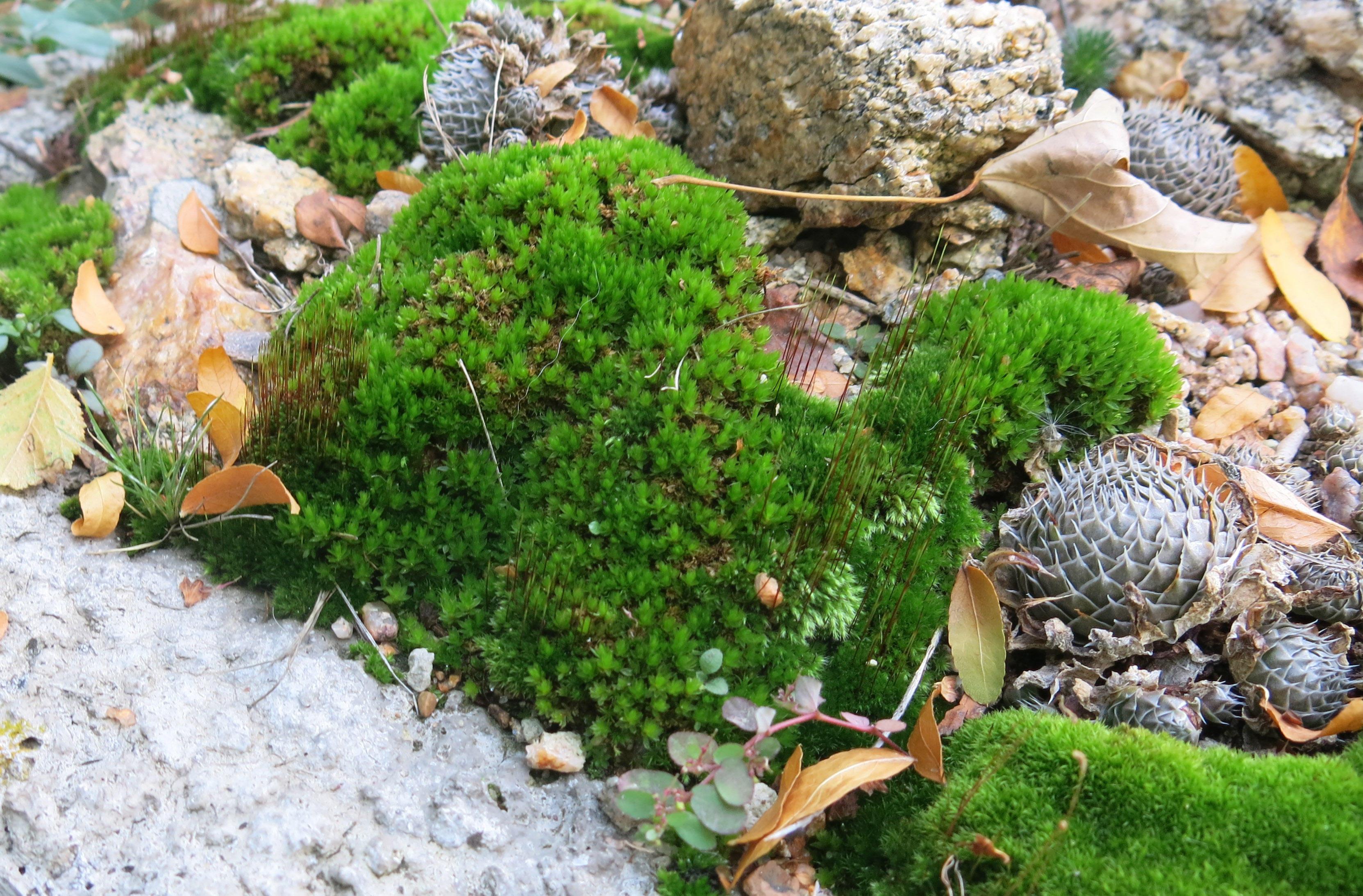 He went back out a minute later to take pictures of the moss growing in one of the troughs, because it’s all green and fuzzy now, and he mentioned George Schenk’s book Moss Gardening a while ago. The moss dries to almost nothing during the summer. This one isn’t so in focus, but he said it was hard to focus when you’re so dizzy. (Orostachys spinosa in the picture, too.)