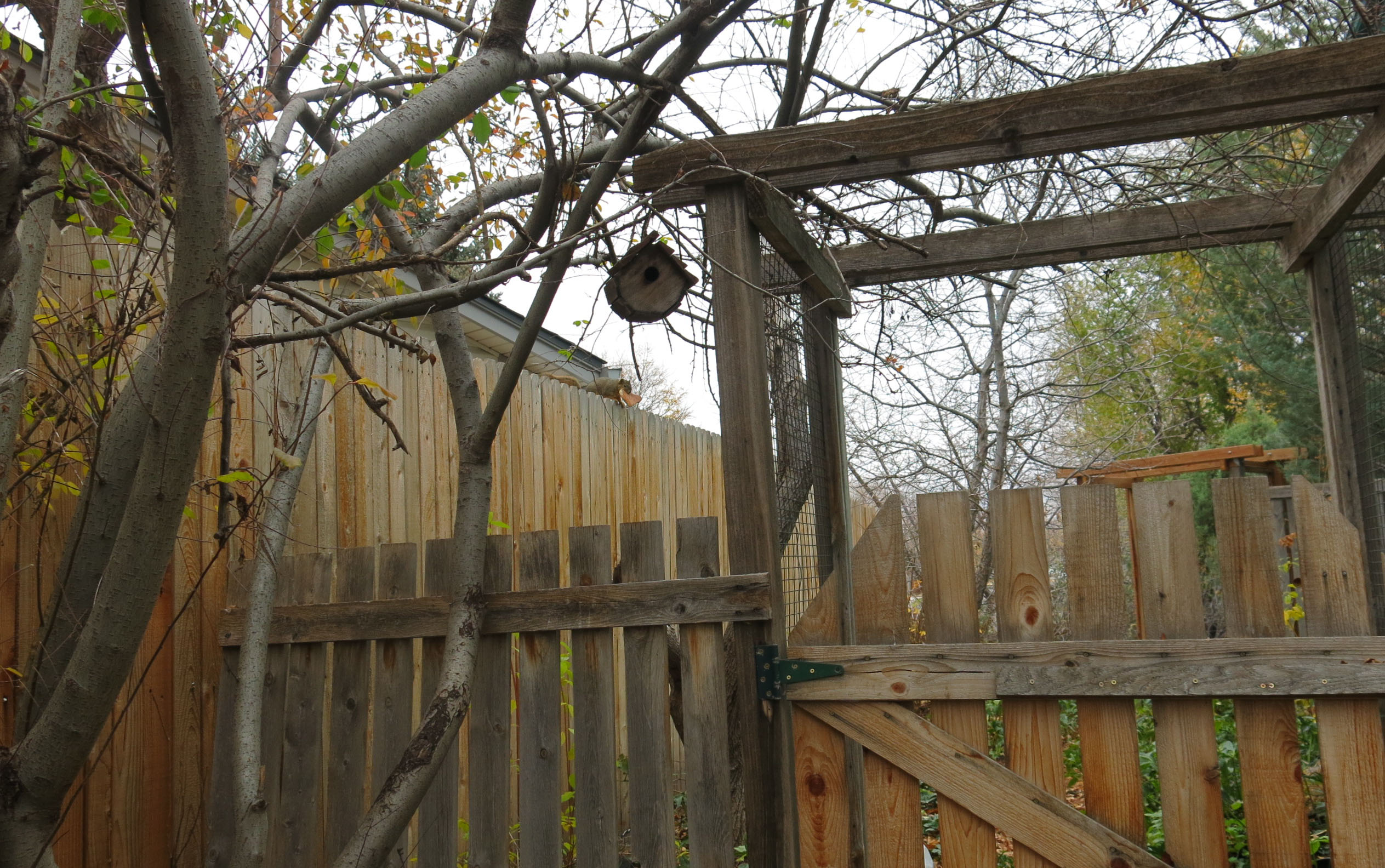 You may indeed wonder about the title of today’s post. The guy I live with has been tidying up the garden in order to get it ready for winter (that’s me watching, in the picture above), and there was all this commotion on the north side of the house, in a place where there usually isn’t much commotion at all. (Look to the left of the wren house.)