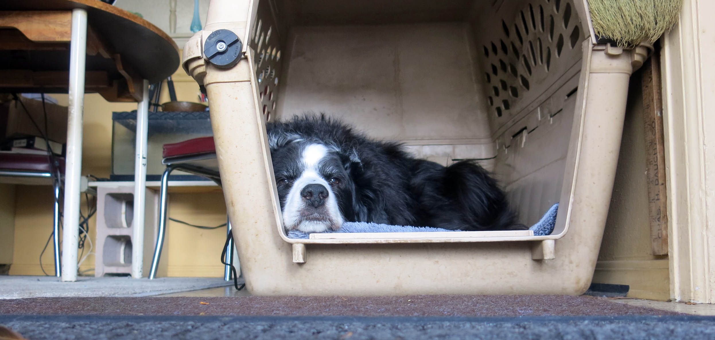 Thanks; it’s always good to be back from somewhere you don’t want to be, isn’t it? We both like staying at home because my mommy made the house so cozy. The snow is mostly gone now, but I’m sure it will come back. We purebred border collies really don’t like to be hot, and that goes for central heating too. Ideally, we would live in a castle, and the guy I live with could sit by the roaring fire in the library, and I could lie on the cool stone out in the hall.