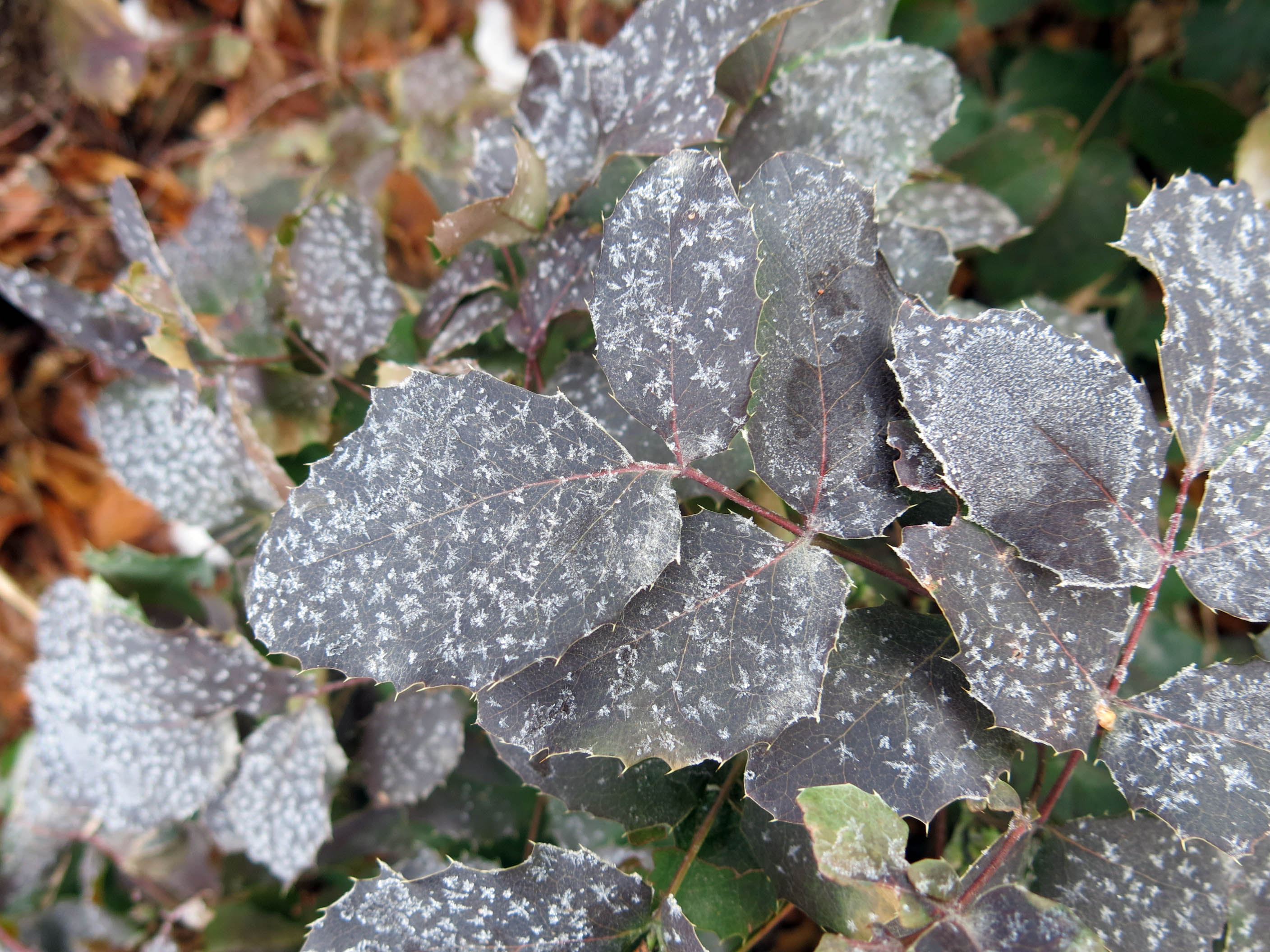We had frost the other morning. We hardly ever have frost here, because there has to be moisture in the air, which there hardly ever is. This is Mahonia repens. It’s seeded all over the garden, as well as crept here and there, which is why they call it repens. This one turns purplish when it gets cold, like some people do.