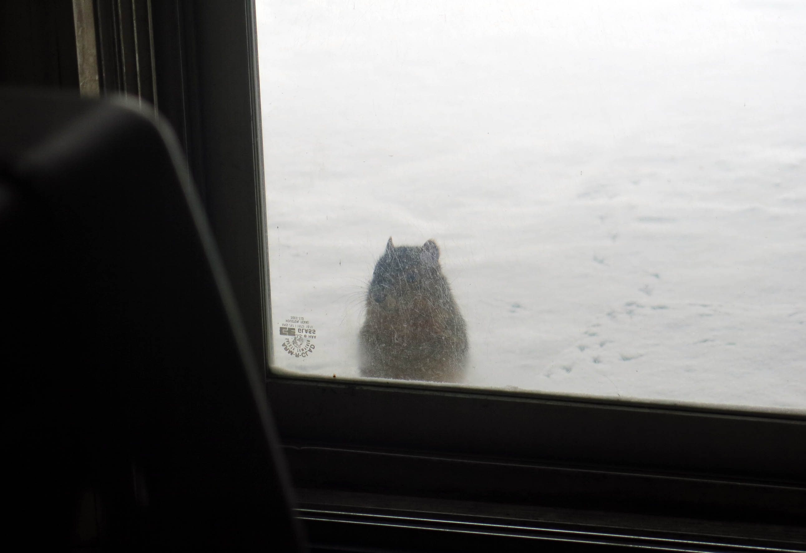 It is indeed very cold, supposed to be about –20C tonight, which is definitely cold. I don’t know who that was at the back door, but I didn’t like it. Though, one funny thing, the guy I live with never noticed the markings on the door before, and he’s lived here since 1985. The squirrels do have nice nests, or drays, up in the locust tree, though I don’t think they have central heating or a humidifier or get tucked under the covers at night like some of us do.