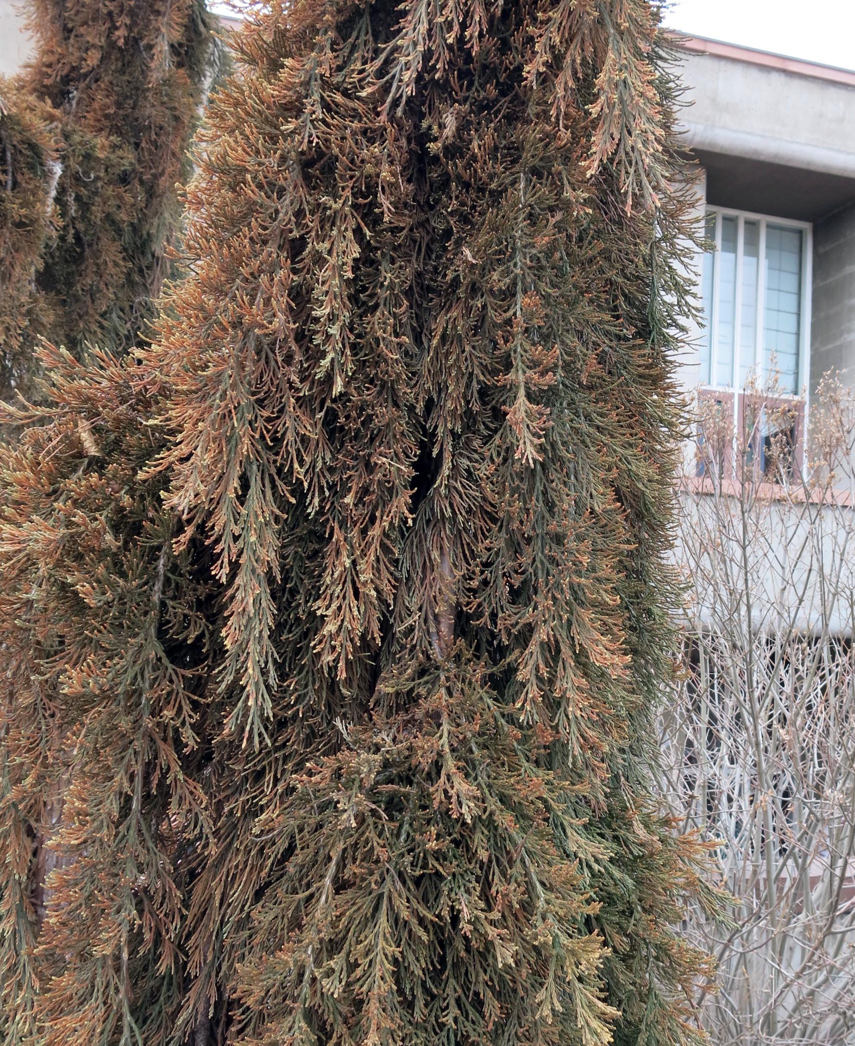 The weeping sequoia. It has a little winter burn, but it will recover.