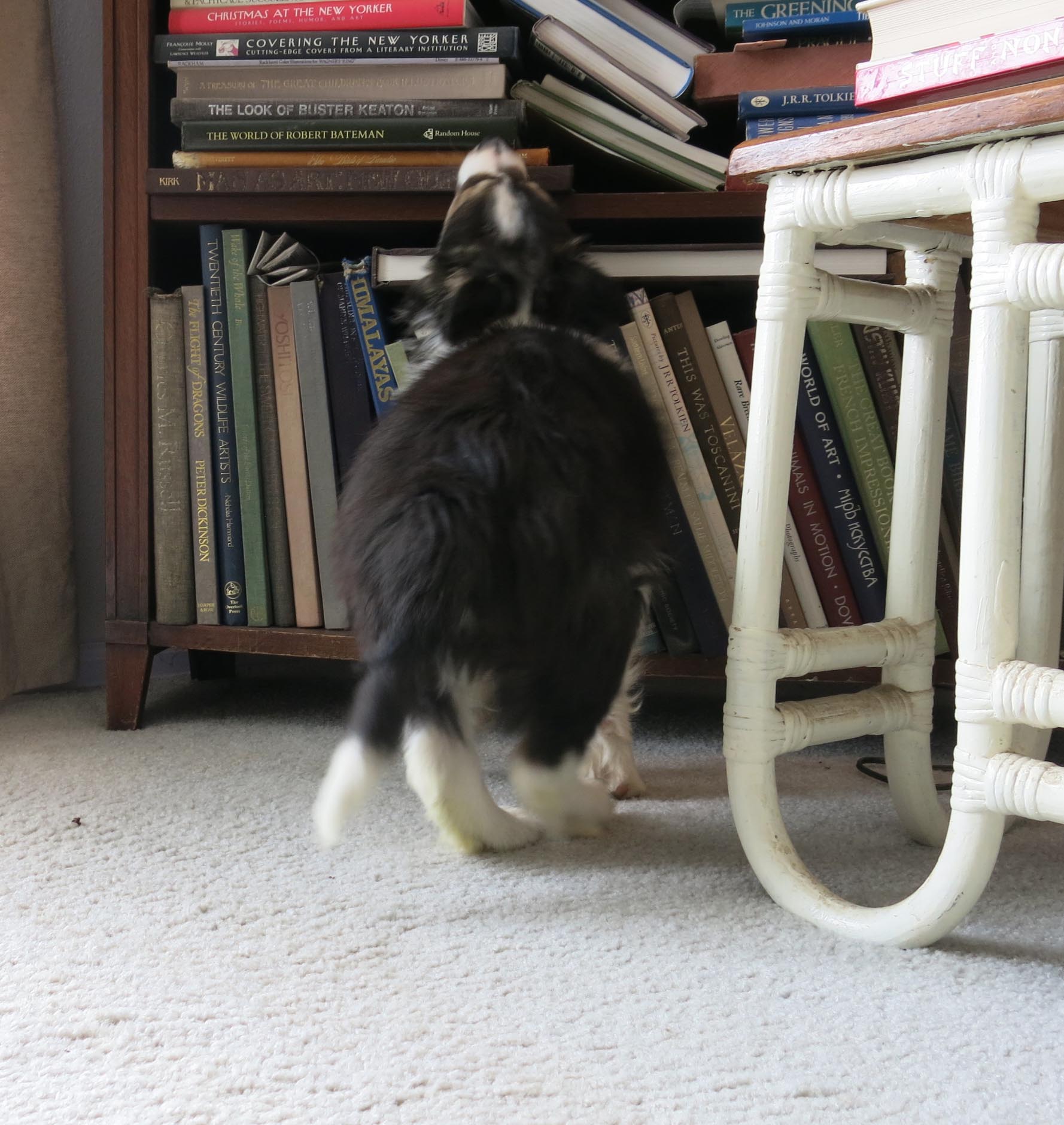 Oh, and also, I learned how to get into the real bed. I know that the guy I live with’s former buddy slept there, and died there several days ago, but as I said, my role here is super important, and I can hardly wait to get big enough so that it becomes my bed, and I can sleep in it just like his last buddy did, because that’s what we purebred border collies do, and I’m looking forward to a good, cozy life here.