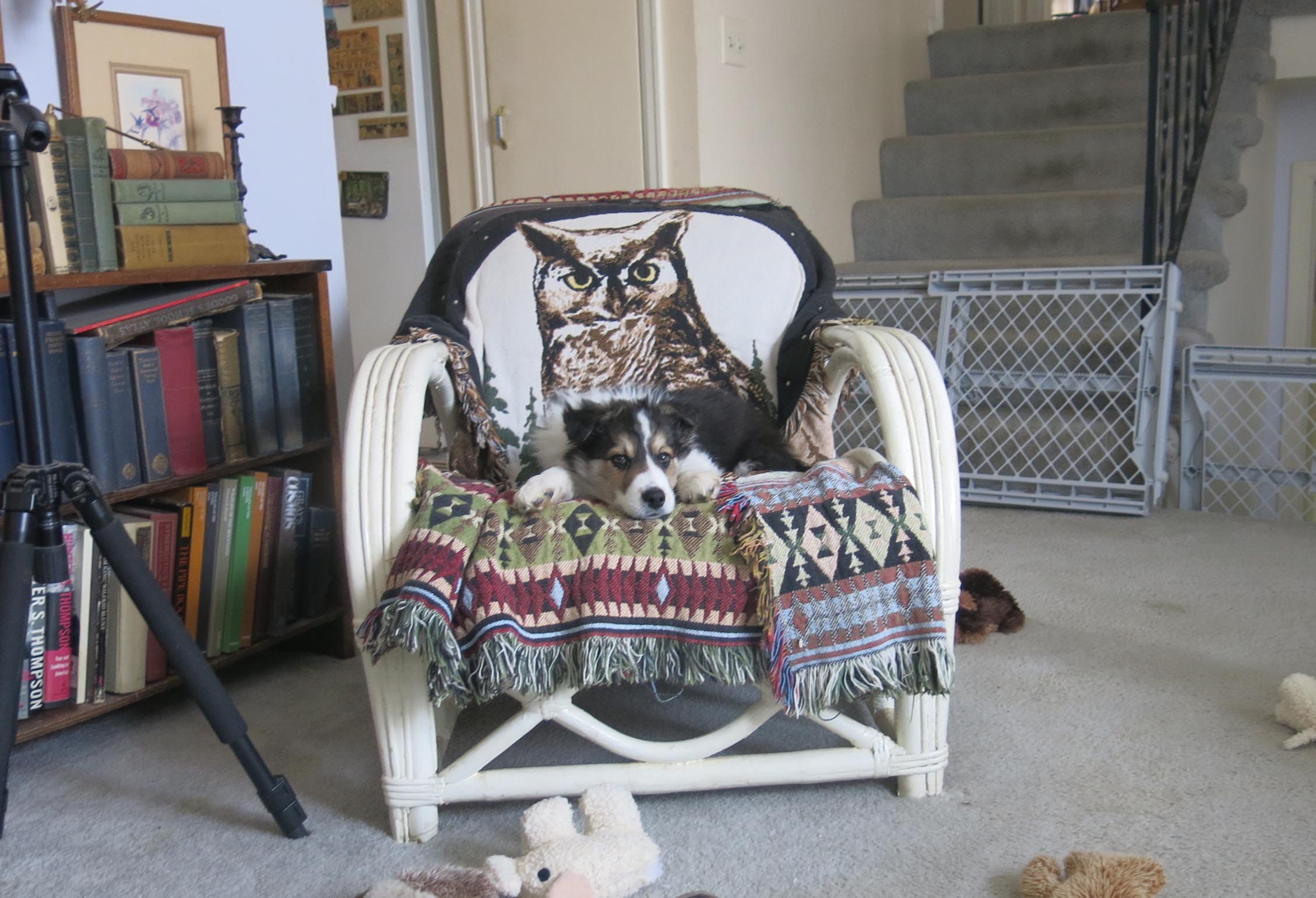 Thanks; the owl on the rug thrown over the chair isn’t so scary. The pictures of me playing tug-of-camera-strap didn’t come out, otherwise I could’ve shown what I thought of that, too.