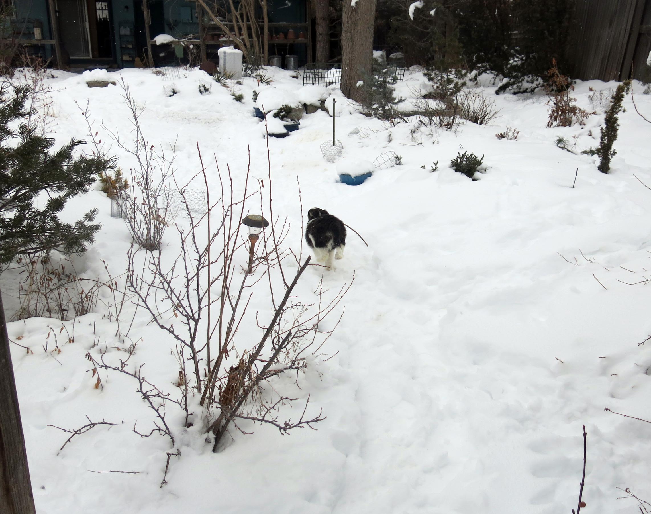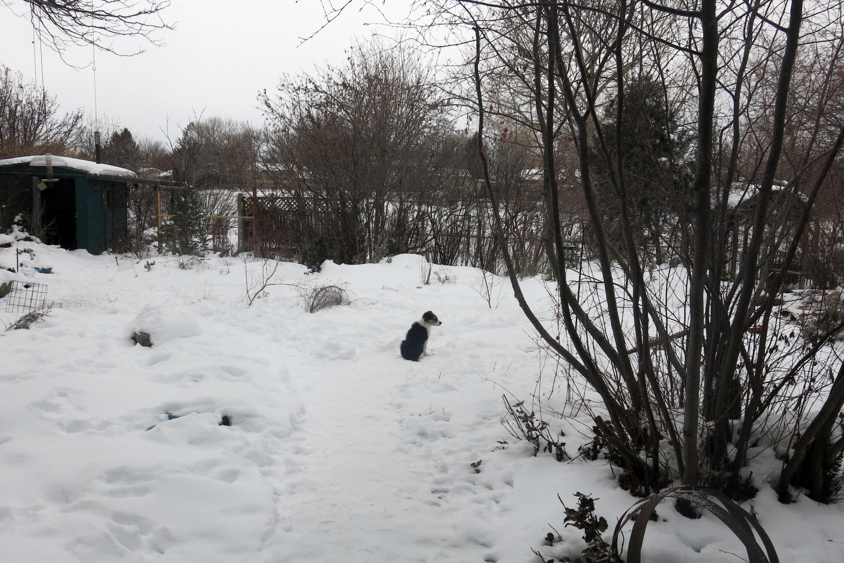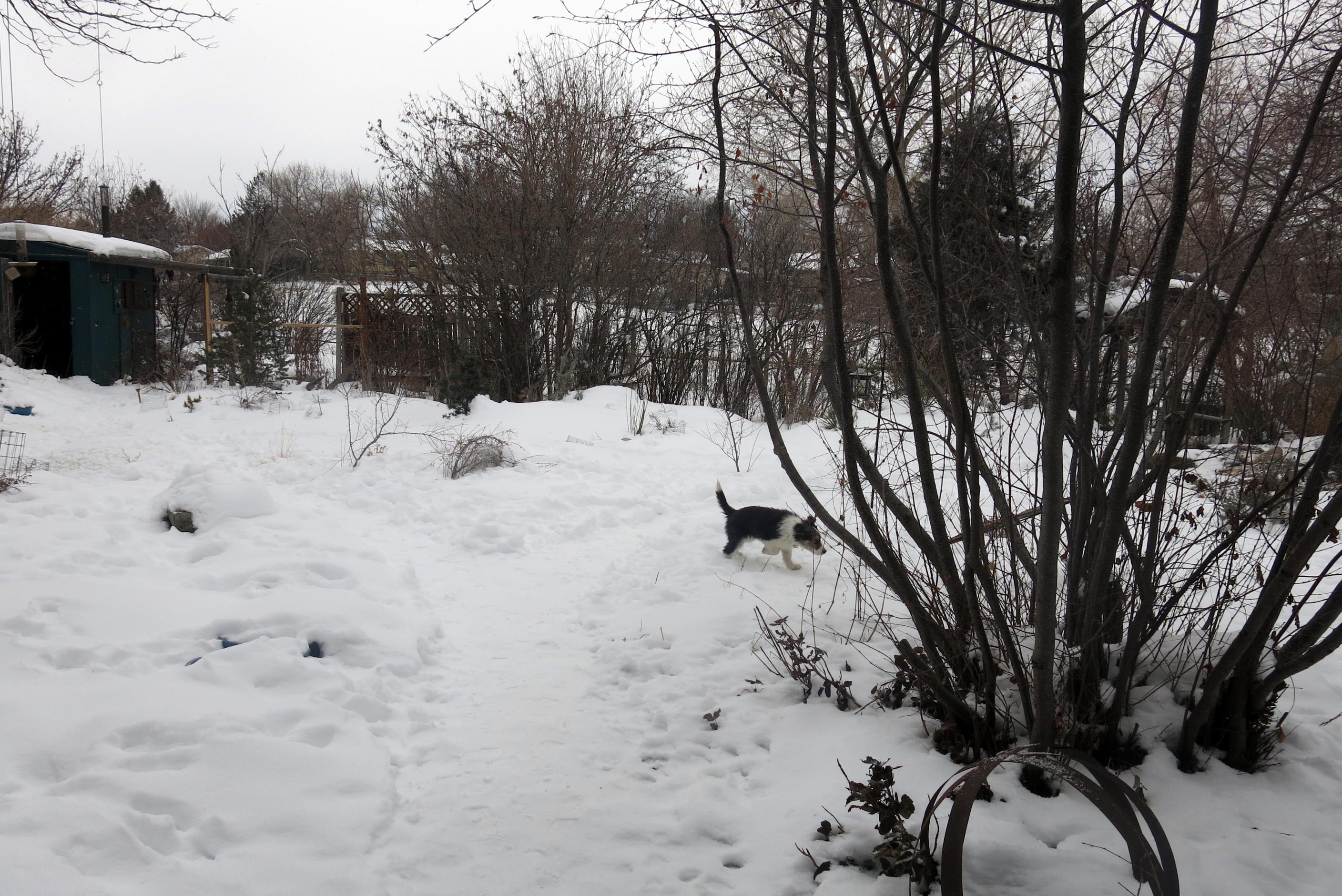The guy I live with said just a little while ago that I’m in charge of rabbit control. I don’t know what that means. Maybe just running after them, which I can do. When the snow lingers on the ground here, rabbits start devouring everything they can find. (Instead of grass.) I see now why he doesn’t like snow lying on the ground for days. I, however, do. Personally, I think he’s drifting a little off center …… I do have very cute hindquarters, thank you.