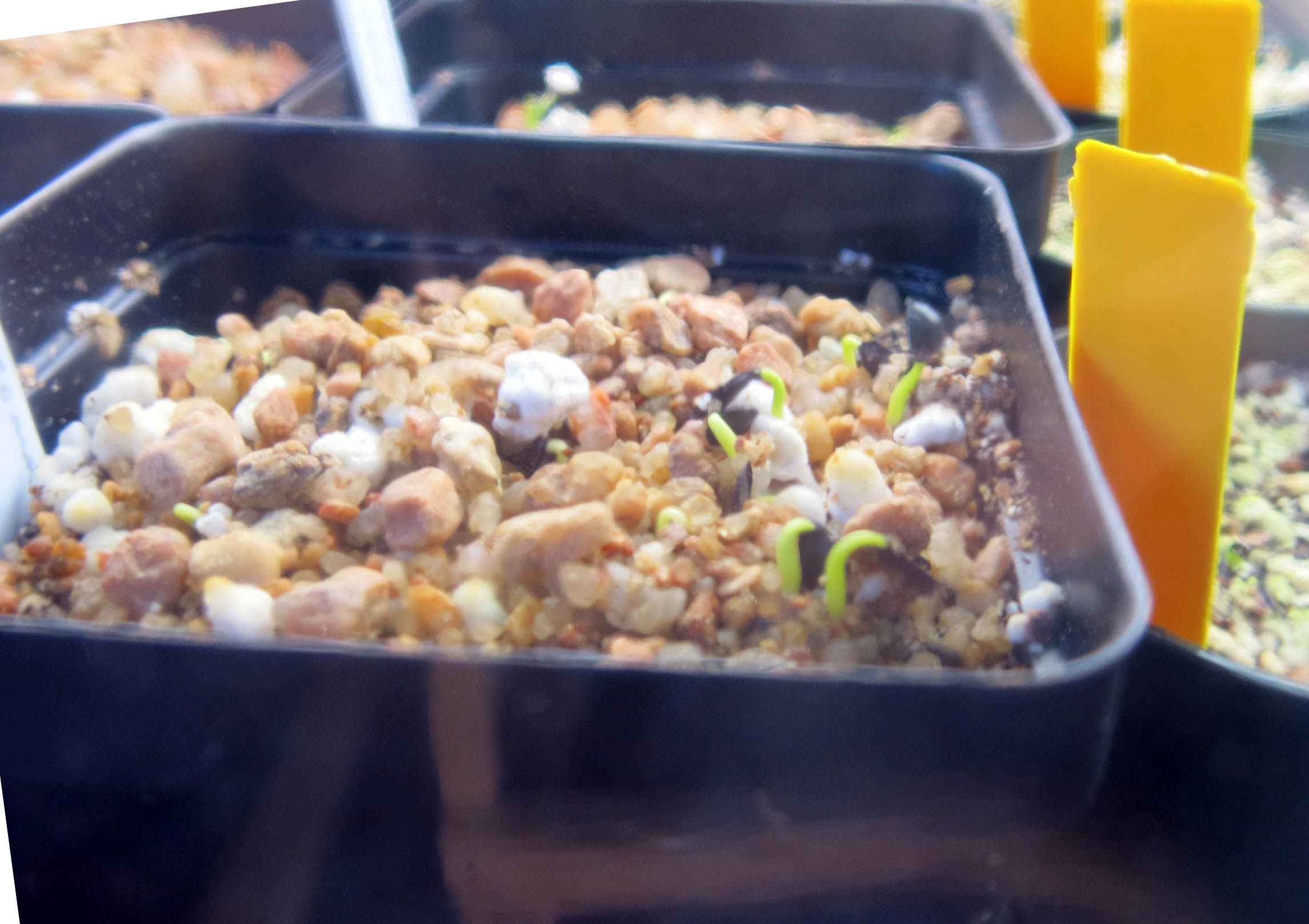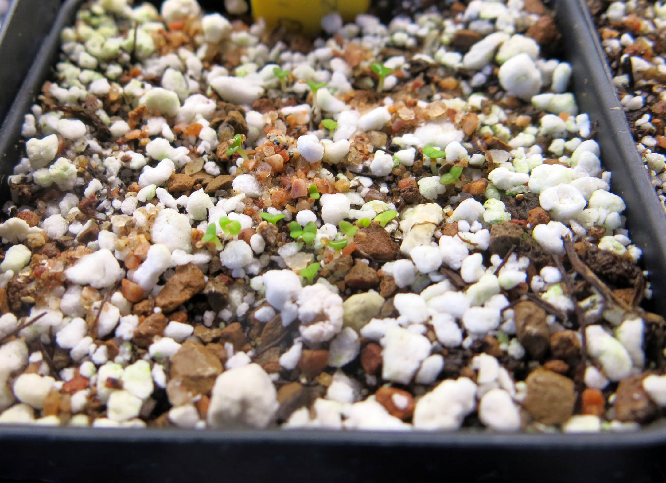 Stuff is happening. That’s about how I can sum it up. I don’t find it all that exciting, but he does, and so I’m going to talk about it now. He sowed some seeds of Titanopsis calcarea (you know, the plant that looks like a rock) a couple of days ago and look what’s happened. The seeds didn’t get as evenly sown as he thought, I guess.