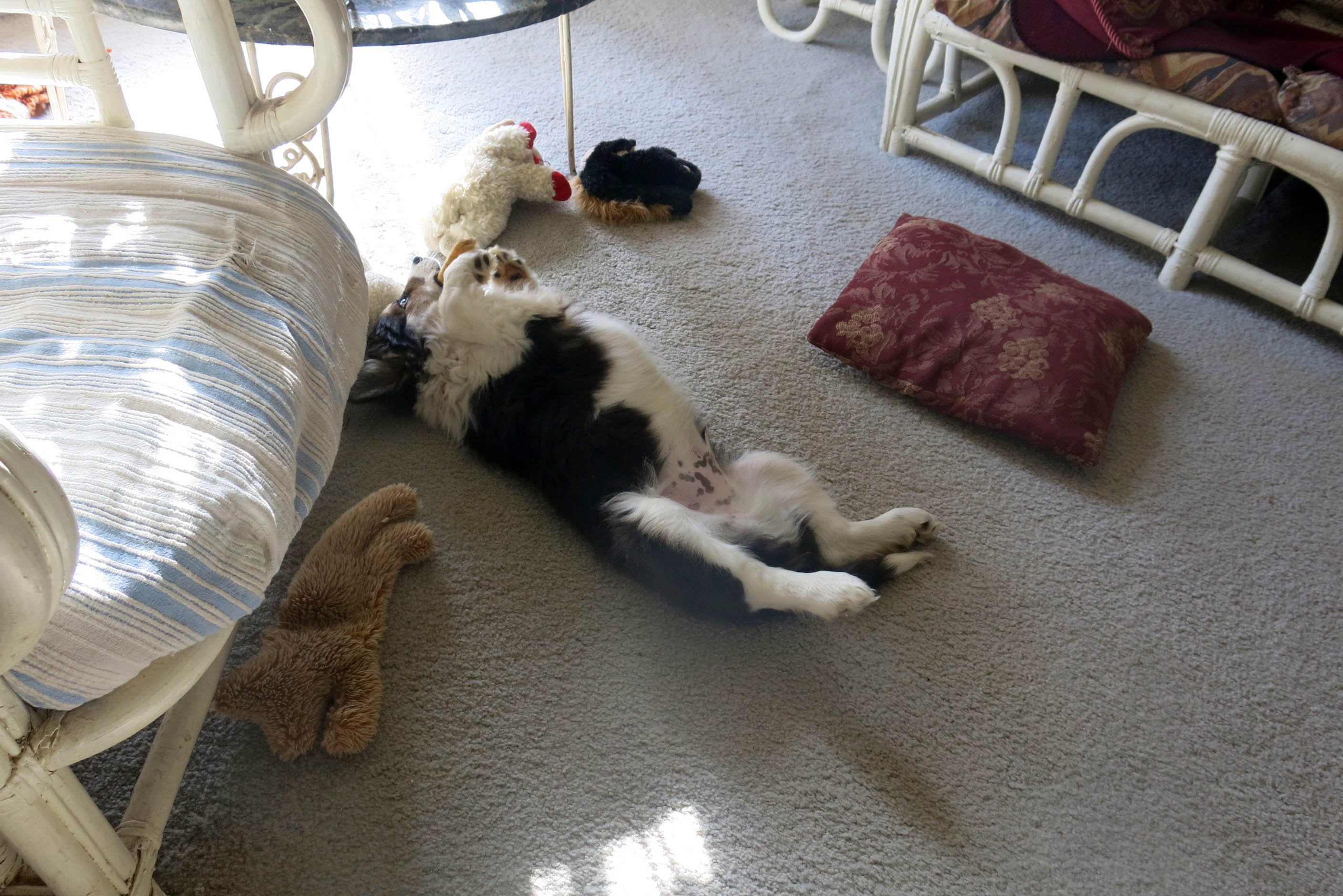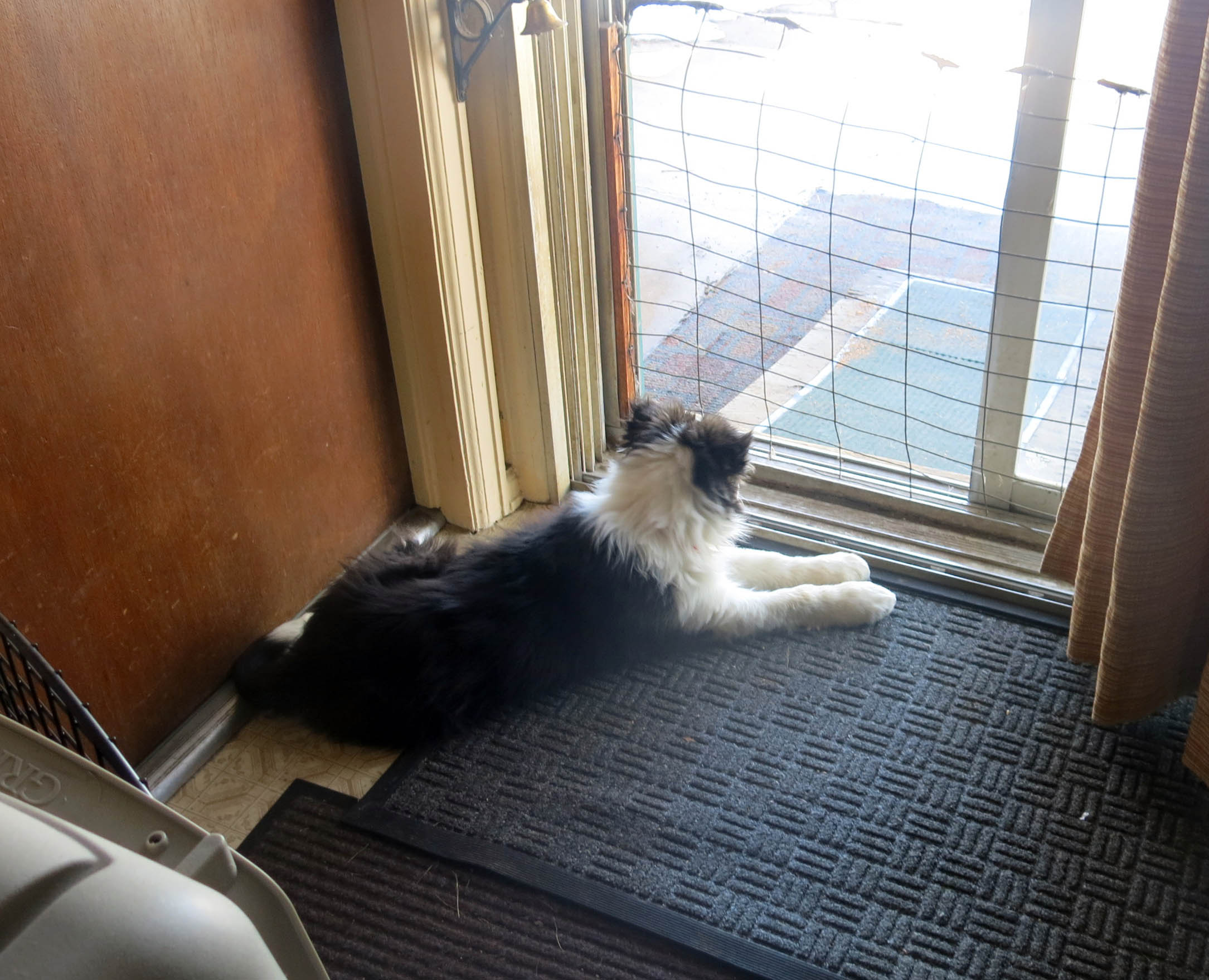 I lay at the back door, in a yearning sort of way. That gate was made to keep purebred border collies out of the house, which I can hardly imagine anyone wanting to do, but I guess in “the old days” there were issues with muddy paws. And now, for the time being anyway, it keeps me inside, but I still get to look at stuff, and we get lots of fresh air.
