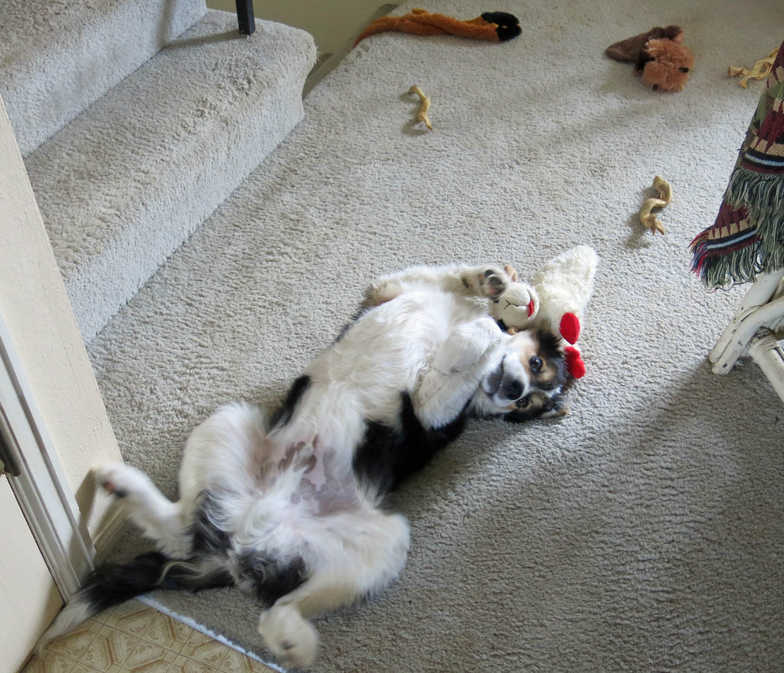 I prefer to remain inscrutable, though the guy I live with says I’m completely scrutable in that I’m always planning something naughty. The guy I live with said that with the first border collie, he put up fences made of string. He’s such a genius. He also says that a partner may be in the future, like next year. About daphnes. The guy I live with says that success with daphnes is mostly luck. They can croak suddenly, just when things look really good. The ones in the carrier were mostly Daphne hendersonii types. In fact, just today, just now really, he finished the “daphnetum”. I was forced to stay inside because I found the shovel too exciting. Oh, and by the way, dragging stuff out of a pond sounds like about the most excellent thing possible. Even better would be dragging it into the house, of course.