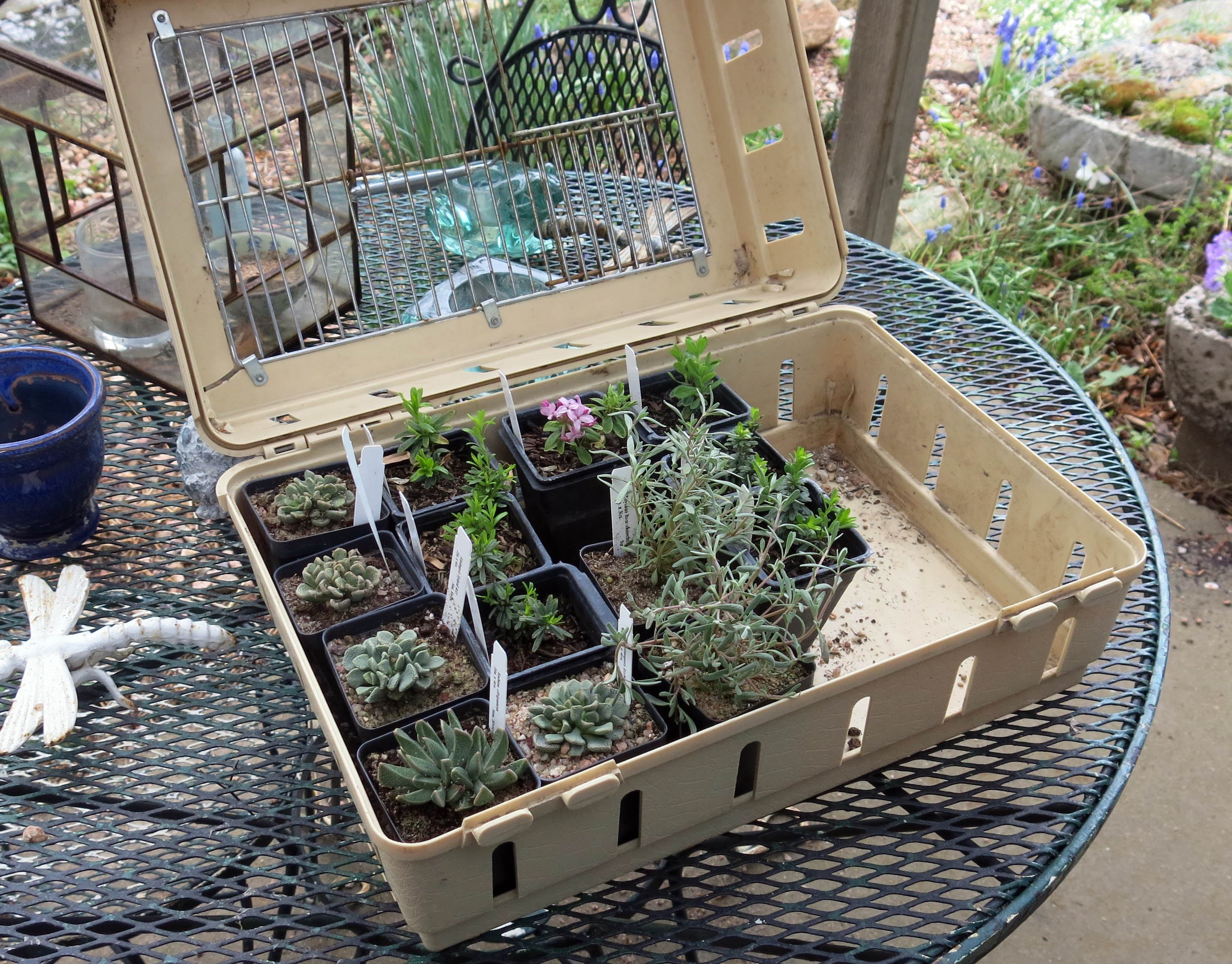 And, yes, the plants (not planted, but still plants) are in what is called a “cat carrier”. I’ve chased a cat or two out of the garden, and I can’t imagine why you would want to carry one, instead of chase the heck out of it, but I don’t know everything. The guy I live with says that when he takes the carrying case to a plant sale, people ask him if he has a cat in there, which he thinks is pretty dumb, since this is obviously really a plant-carrying case, and who would bring a cat in a case to a plant sale anyway. They used to sell the cases at plant sales, just for this purpose.