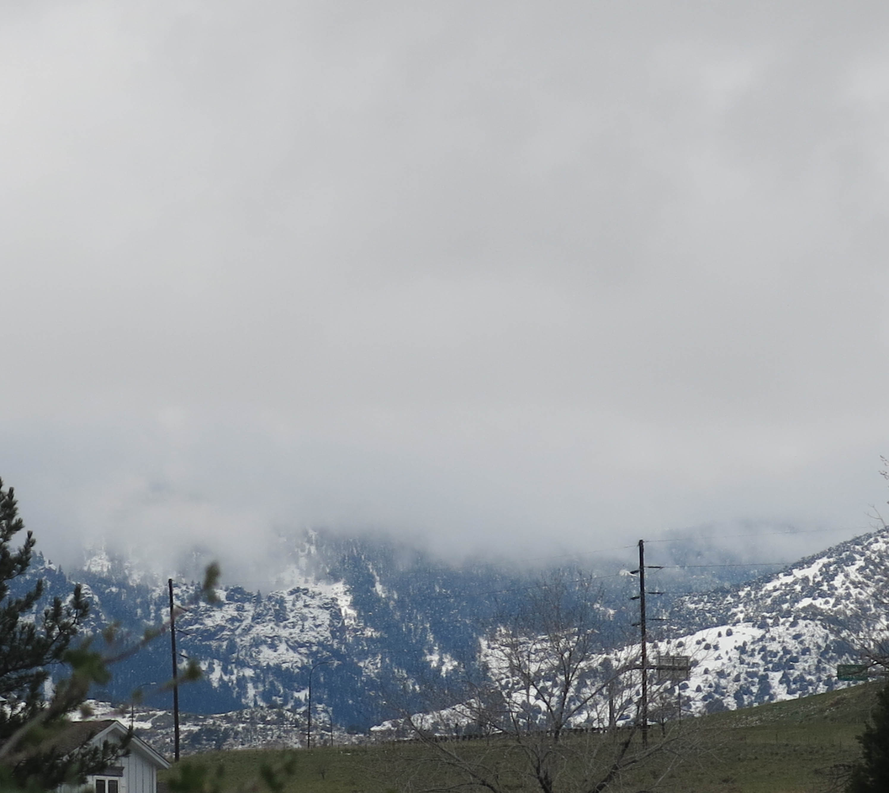 It’s been pretty chilly and cool, the way it can be, or so I hear, with a little snow, and some rain. The guy I live with said it was too cold to work in the garden, which I think is just an excuse, though he is suffering from sciatica, so he has a good excuse. I guess. You can see how chilly it is by looking at this picture of the foothills.