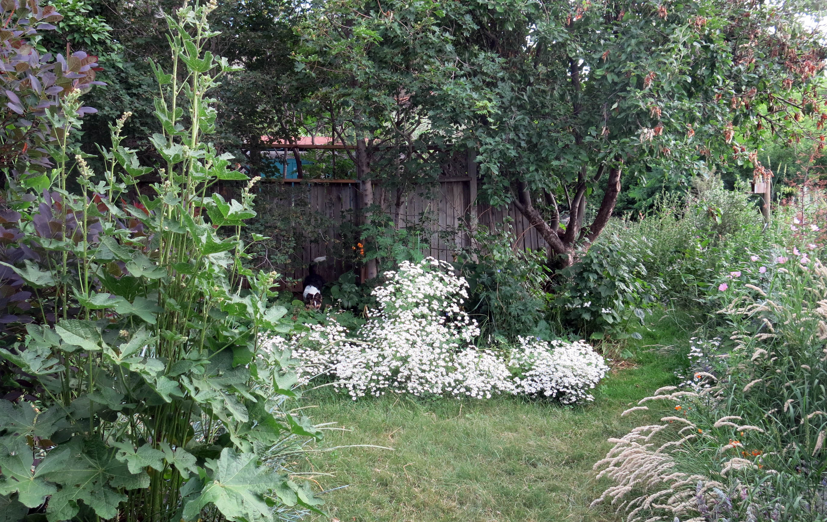 The ‘way back” is really overgrown, and my private lawn is being encroached on. The white here is from Tanacetum niveum.