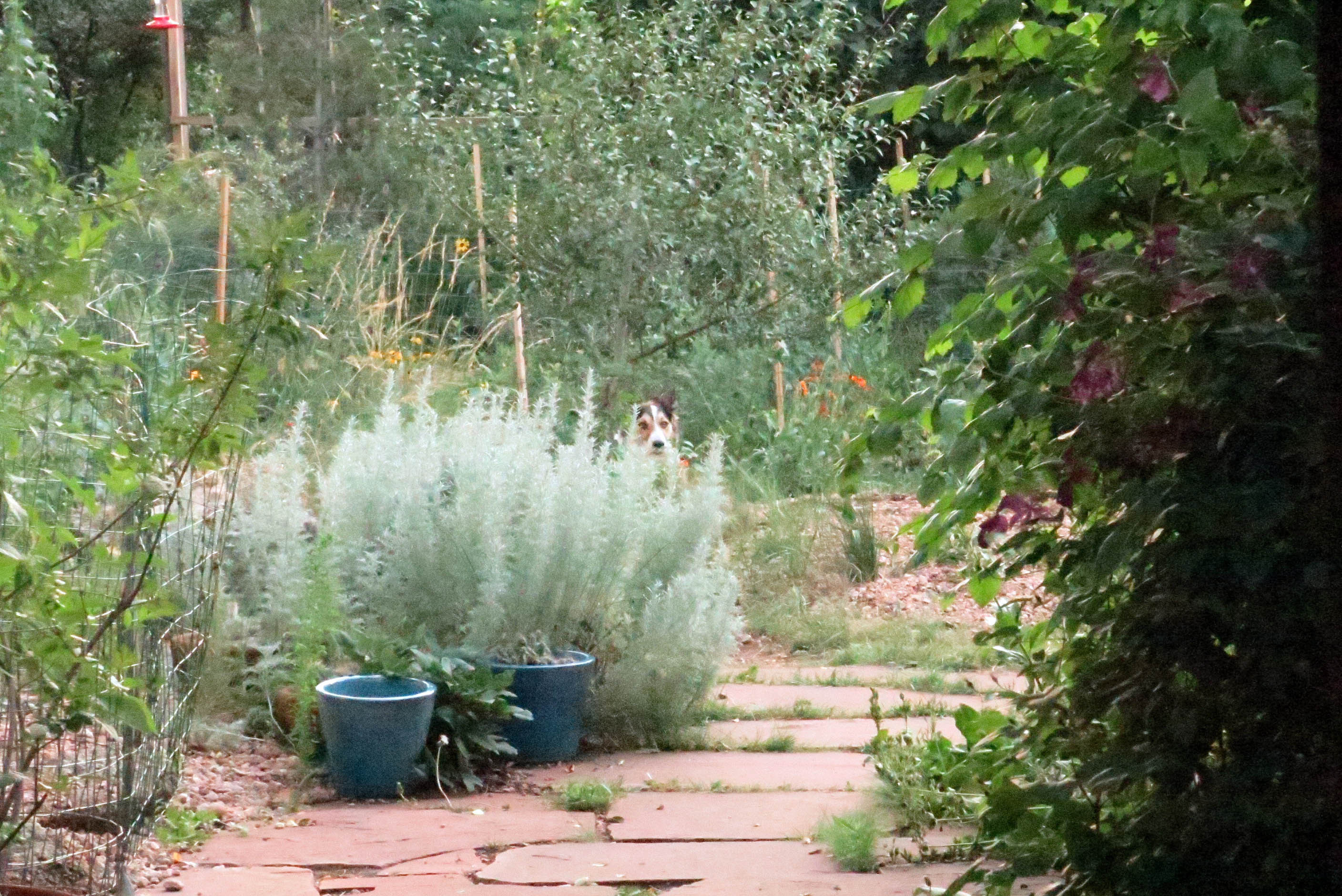Our place is crazy with lavenders, all kinds. They come from a wonderful herb provider, Pearson’s, which is in our north county – I wonder, could you be a dog there? – and offers many varieties. Like, many. Who can remember the names? The guy you live with is doing very well to remember the names he does. (Quick, ask him what his name is.) I approve of a lavish display of lavenders, and even the veil of artemisia you pose coyly behind. Or watchfully. Or something. (Ask me if I remember my name. It’s Saturday Martini Night and we’re celebrating rain. At last, enough rain. Plus, we have Colorado and Texas to thank for our filled water sources. Your rain was worth it. Maybe not the darkness.) I know we used to have ancanthus around, I wonder if we still do. I shall go and look. Happy birthday to your guy. Tell him to celebrate by seeing the movie “Minions,” and possibly smuggle you in. One of dogs – Shred, the Maltese – is definitely a minion. Who needs a Whole Foods hedgehog.