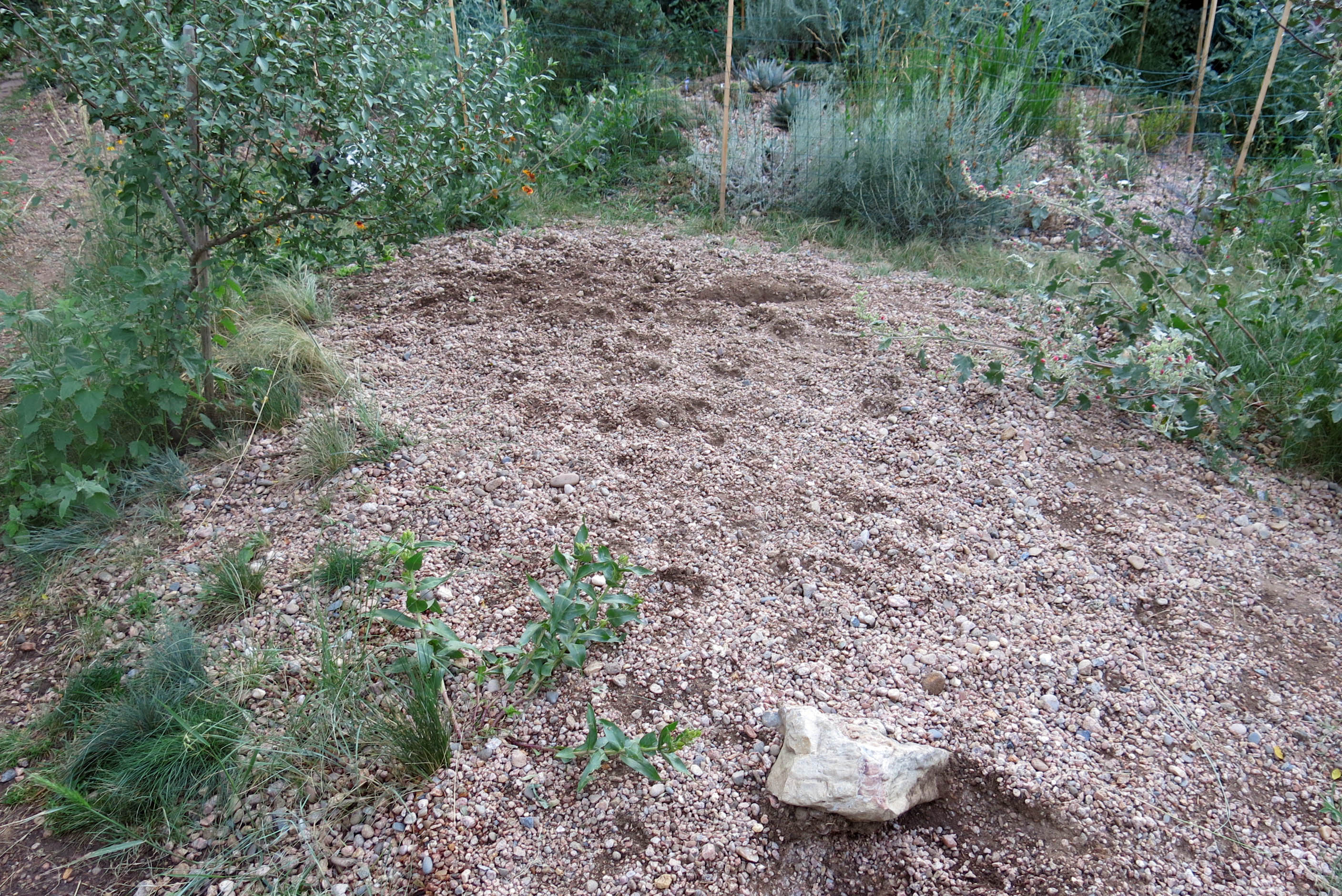 He says the lavenders are going here, but I kind of doubt it, because this is where I like to romp. You can also see that pile of gravel and sandy loam in the first picture. He says I can romp and there can be lavenders, too. That I really doubt.