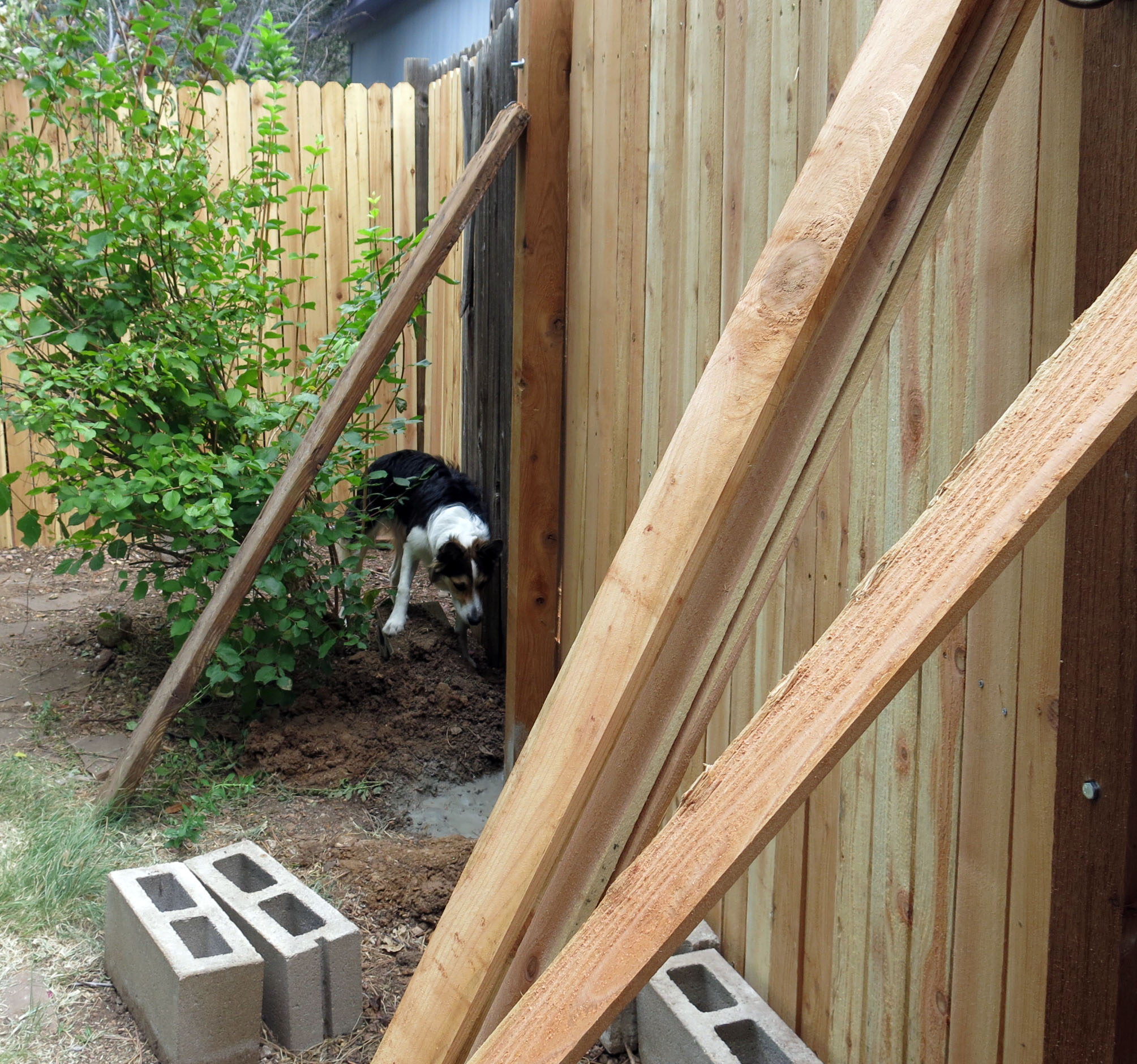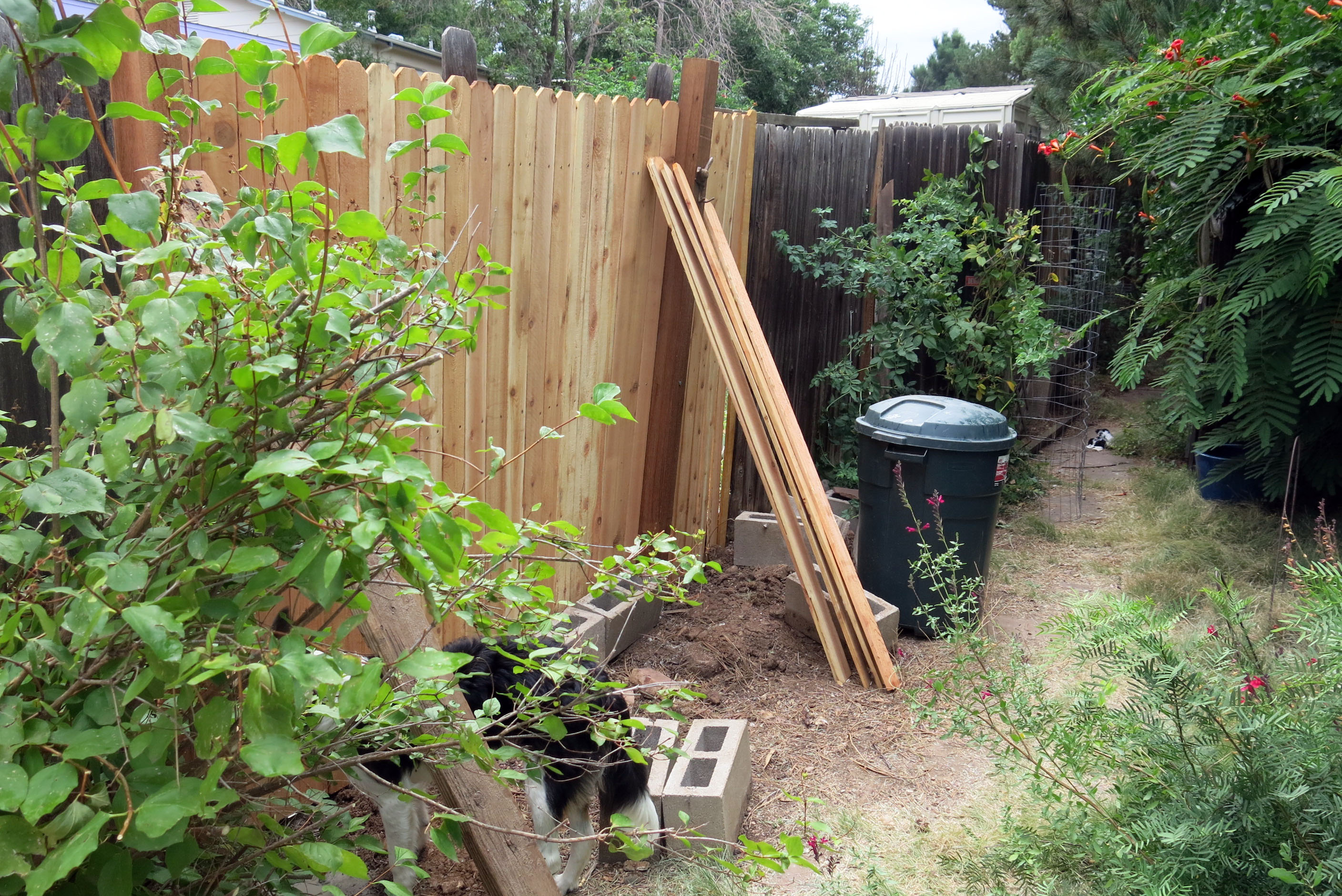 He put up a four-by-four but couldn’t get it completely upright, so it leans a little, too. He said that was okay. All the pickets were falling to pieces and so they got replaced. The guy I live with said that the fence work done in this neighborhood, when it was built way back when, was not exactly quality work.