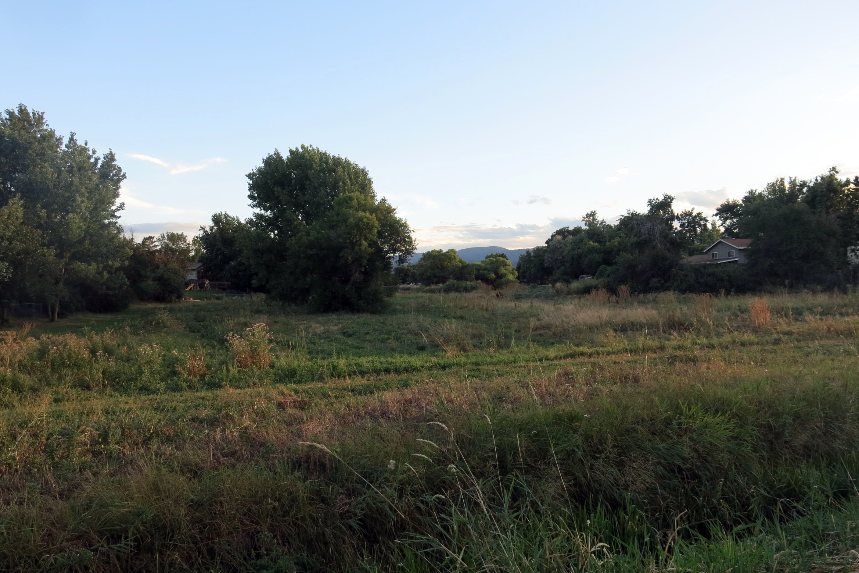 There was water in the creek for a while this spring, and I got to splash in it. The creek is on the left, and winds behind that first tree there, and then goes south. It comes from the mountains.