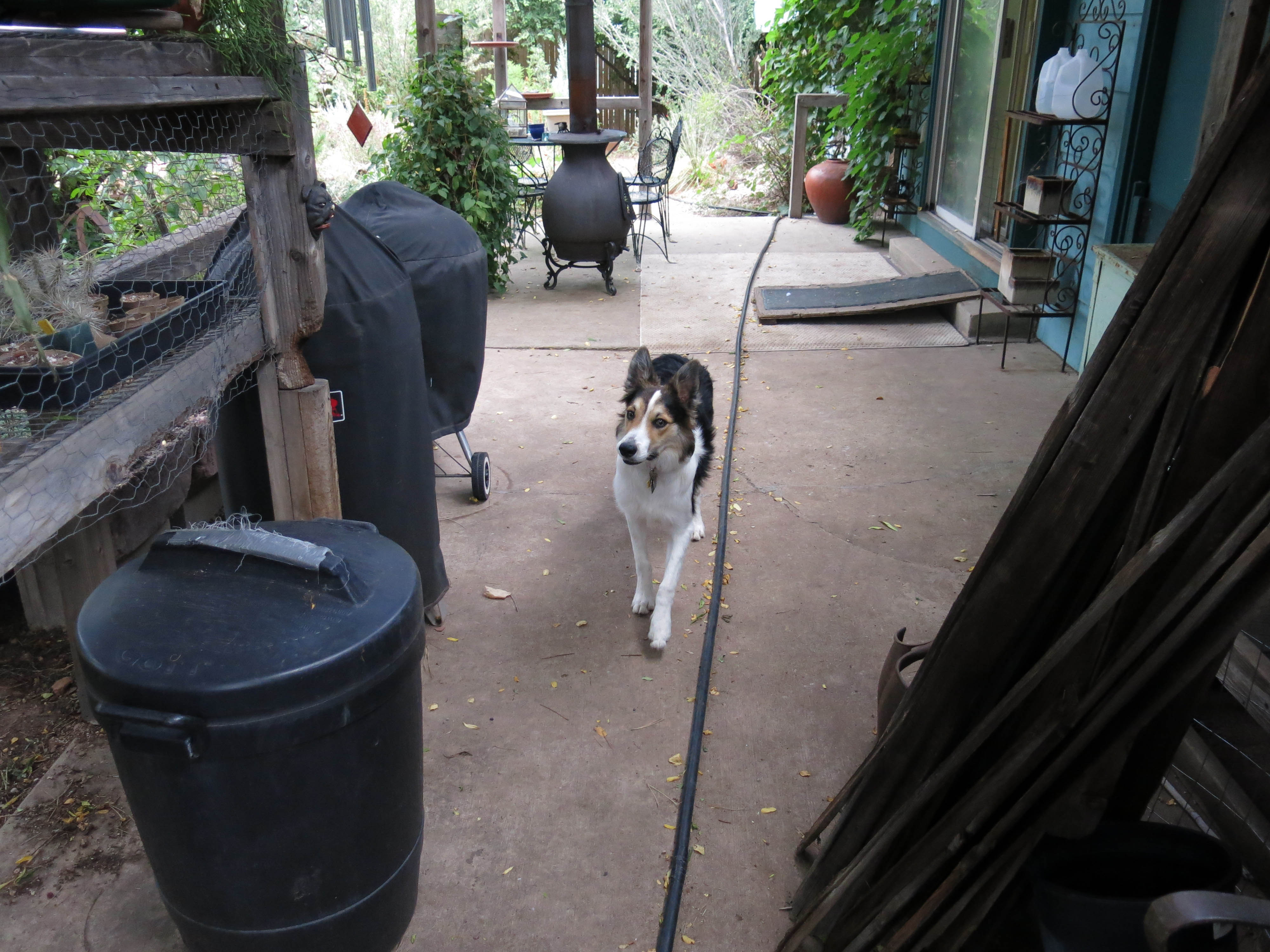 A purebred border collie always has to be on patrol, you know. This is me looking at a squirrel in the grape vine. You can see the old pickets from the fence on the south side. The trash can holds potting soil.