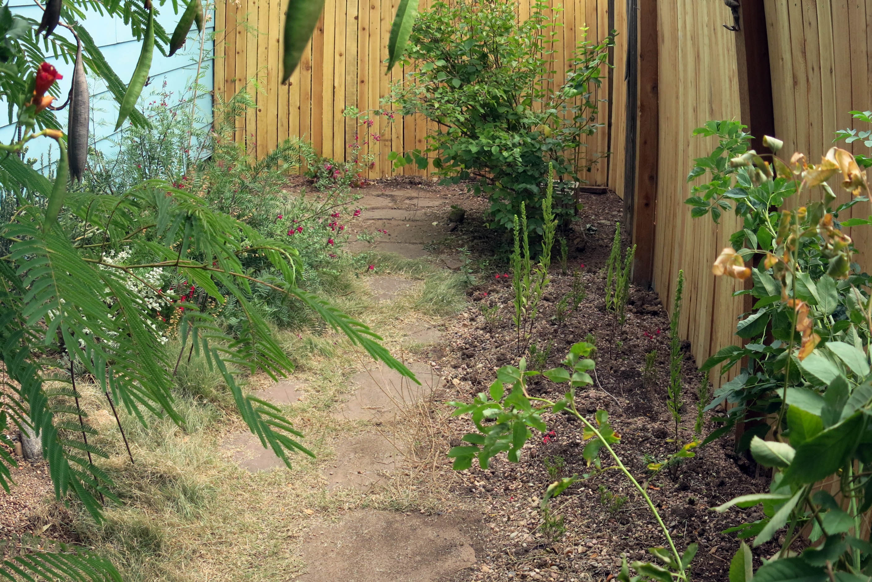 The south side of the house got finished, and there was even some planting done while I was at Day Care. (I got a good report card this time.) You can see the one post kind of leaning. Technically, the camera distortion wasn’t fixed properly, so some of the fence looks oddly bowed, but as we say around here, “Whatever”. The buffalo grass got kind of trampled while the work was being done.