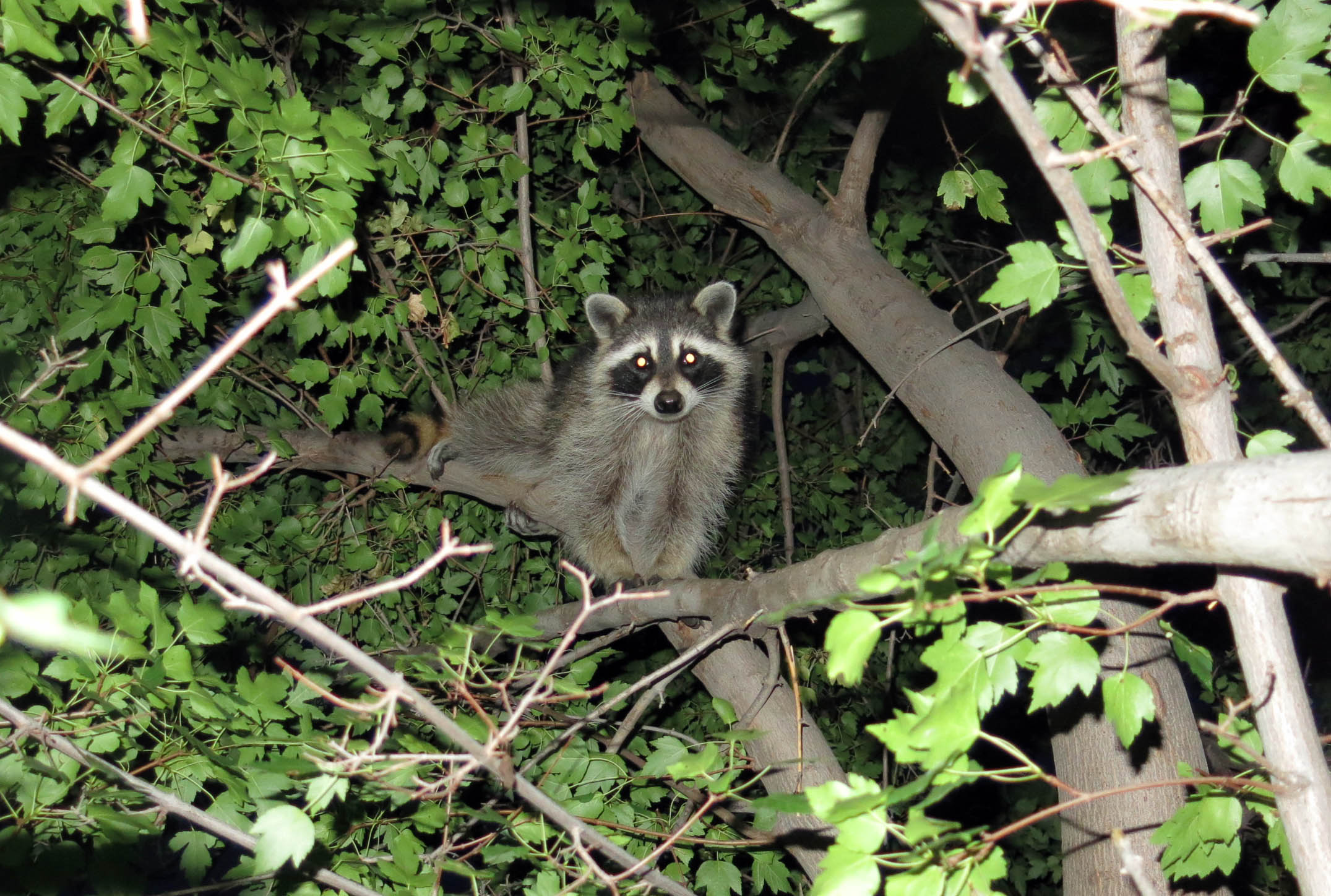 I wasn’t terribly happy about it. The guy I live with said all the raccoon wanted to do was sit in the maple tree and munch on leaves.