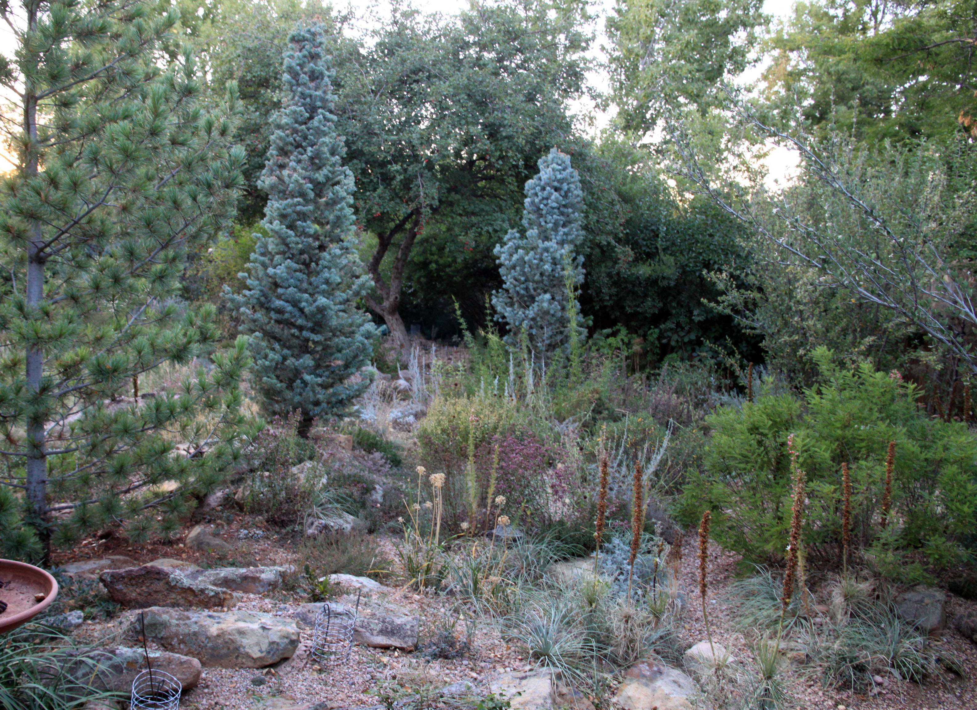 Yes, thanks, the cold eyed stare. The conifer is Abies lasiocarpa var. arizonica ‘Compacta’, or some such thing. Fastigiate blue spruce behind, still tied up from last winter. He doesn’t really mind the sciatica; it gives him an excuse to get out of things, sometimes. Without going into detail, it happened the night Chess died. So it’s not really a bad thing. The guy I live with says that Aster lateriflorus won’t survive here. Tried it several times. Much too dry. But there are other great ones. Vines, maybe.
