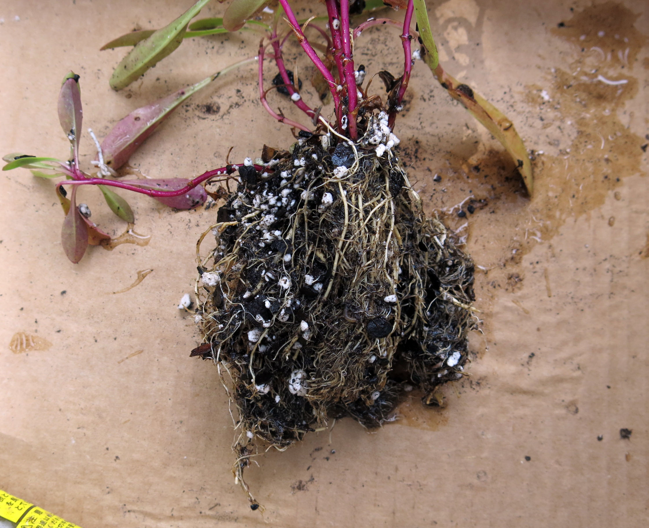 Add to that a hopelessly root-bound plant and you have something formidable to deal with. The guy I live with says that when you have a root-bound plant growing in nursery gunk you have almost zero chance of the plant’s survival, since the roots are so tightly bound together they have no chance of growing into the surrounding soil, which the guy I live with says means “establishment”, and combined with the gunk, doom is almost certain, unless you do something.