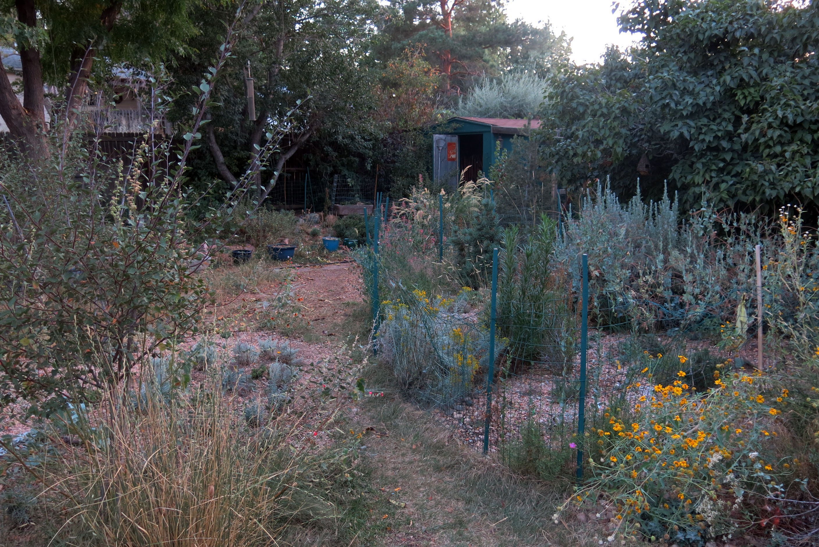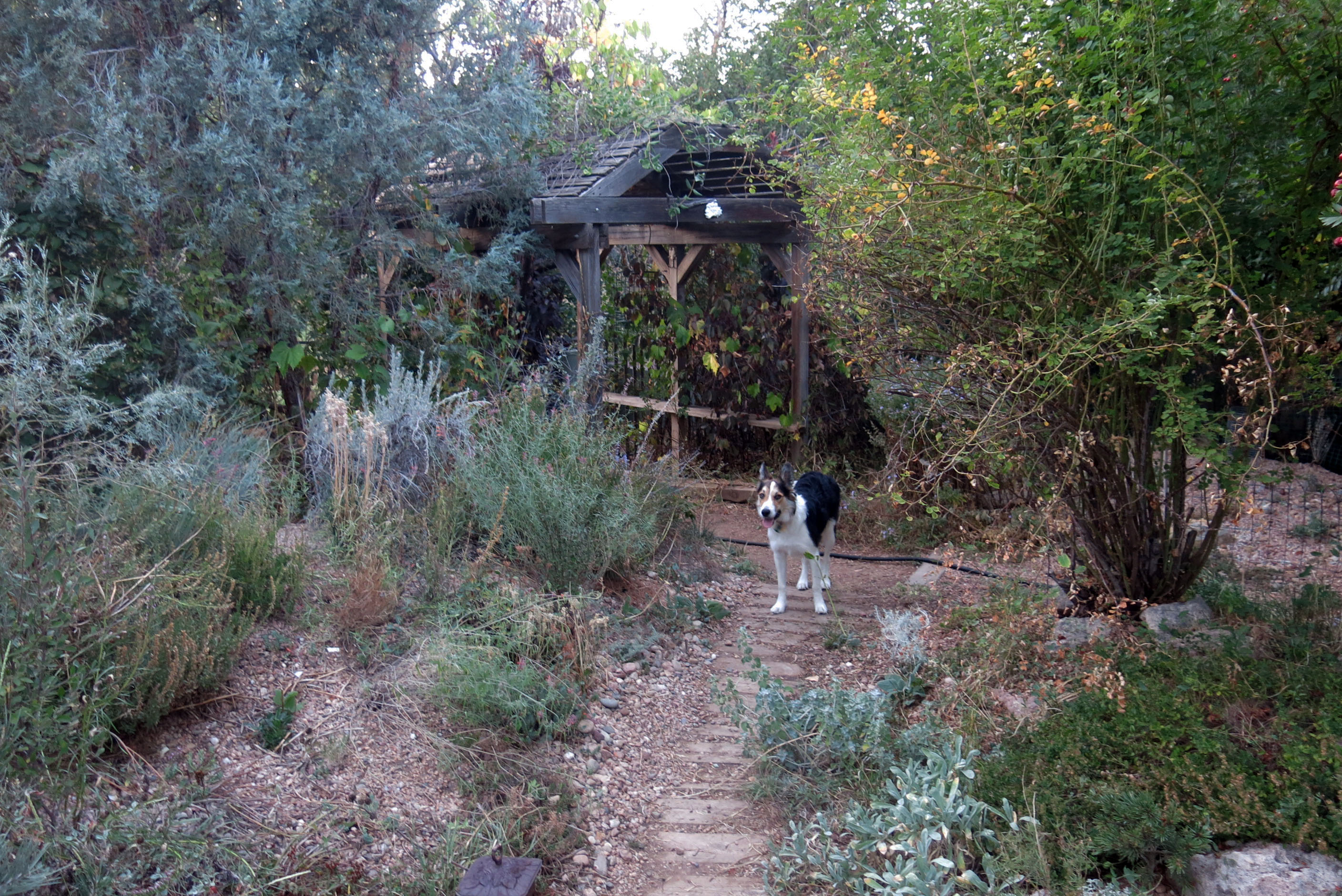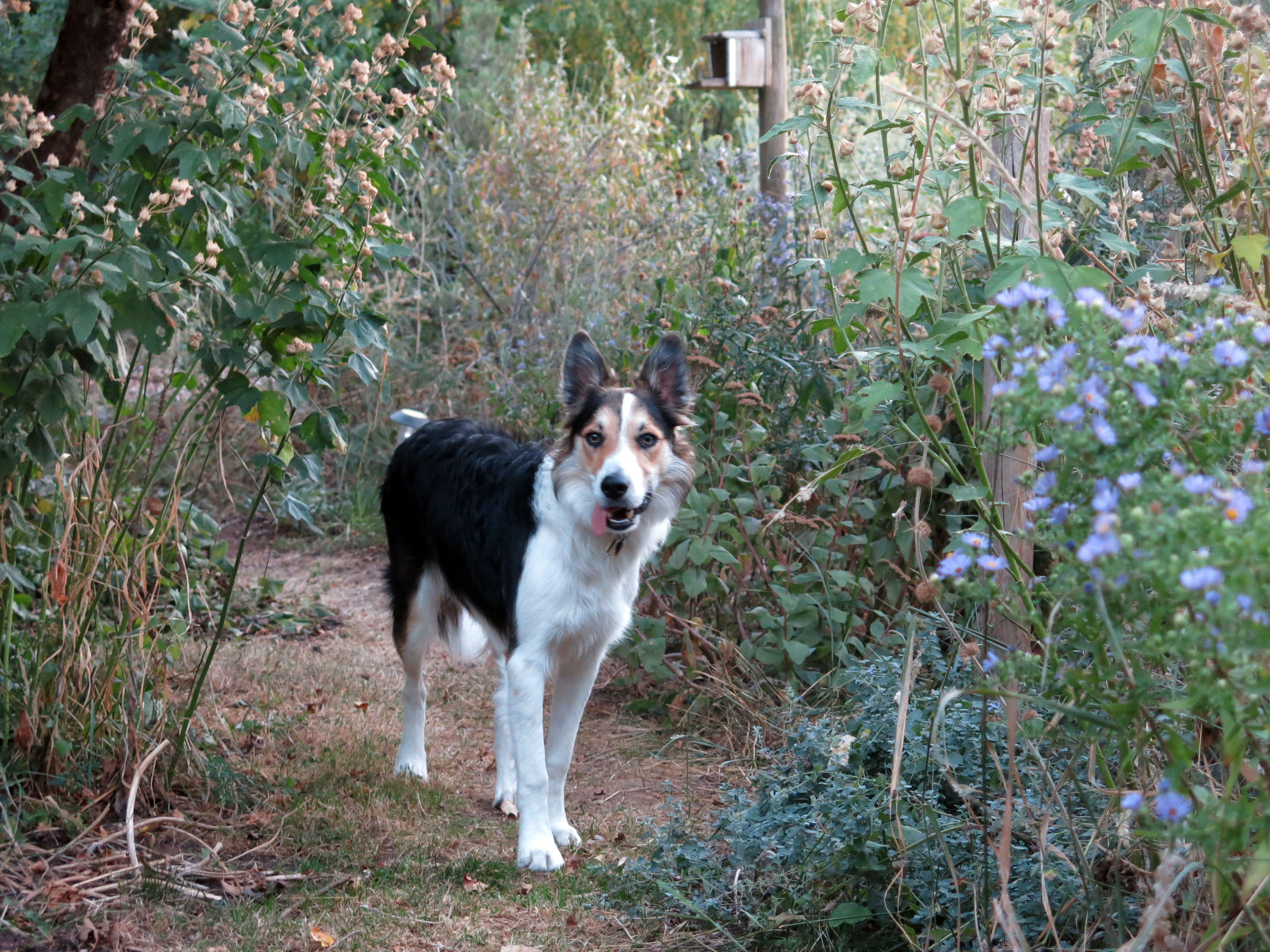 Here I am standing at the end, or maybe the beginning, of “Pooka’s Shortcut”. Pooka was a purebred border collie, also with radar ears, who live here quite a while ago, and instead of going all the way around the raised bed on the right, he decided a shortcut was in order, and so now there is one. This part of the garden is super dry too.