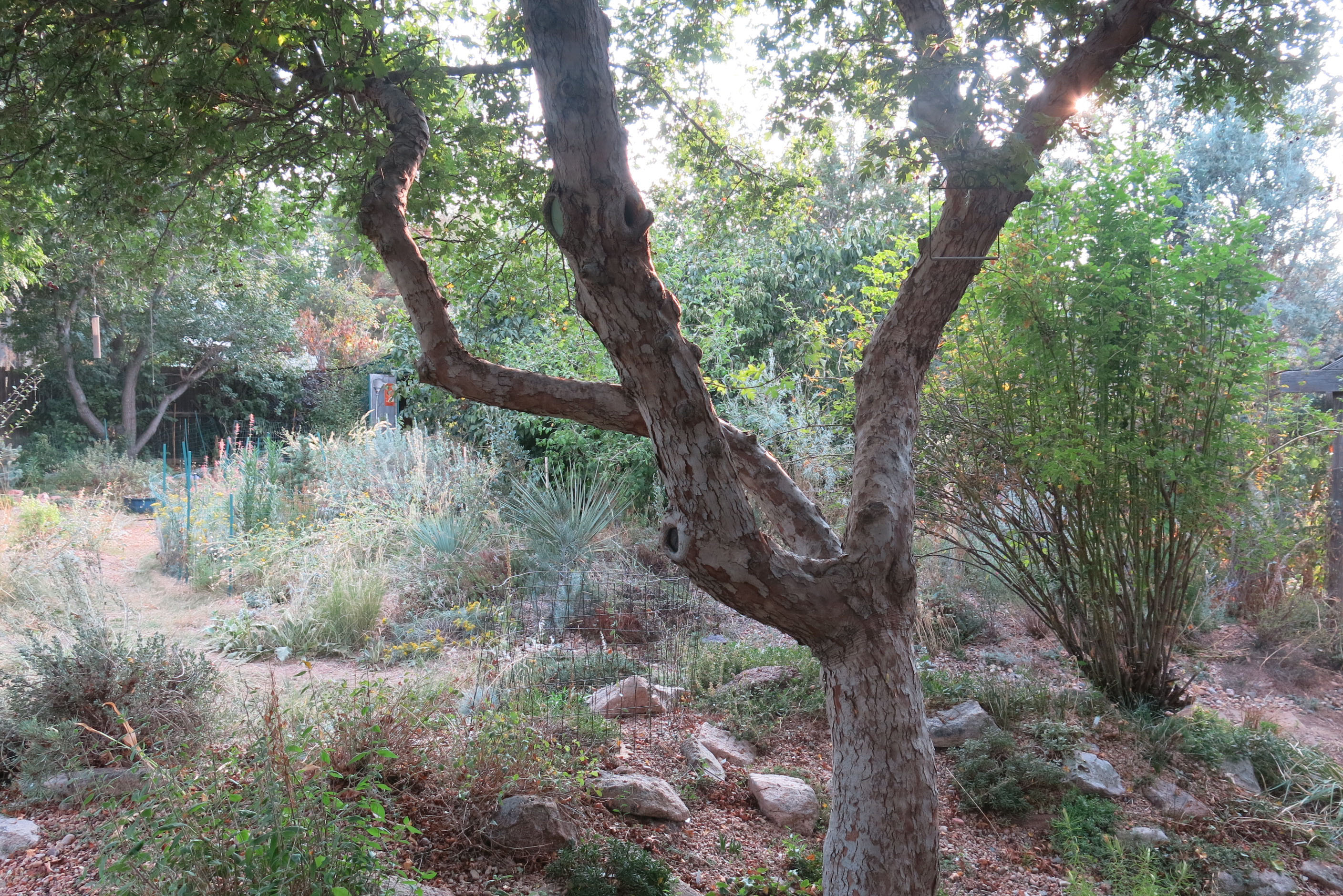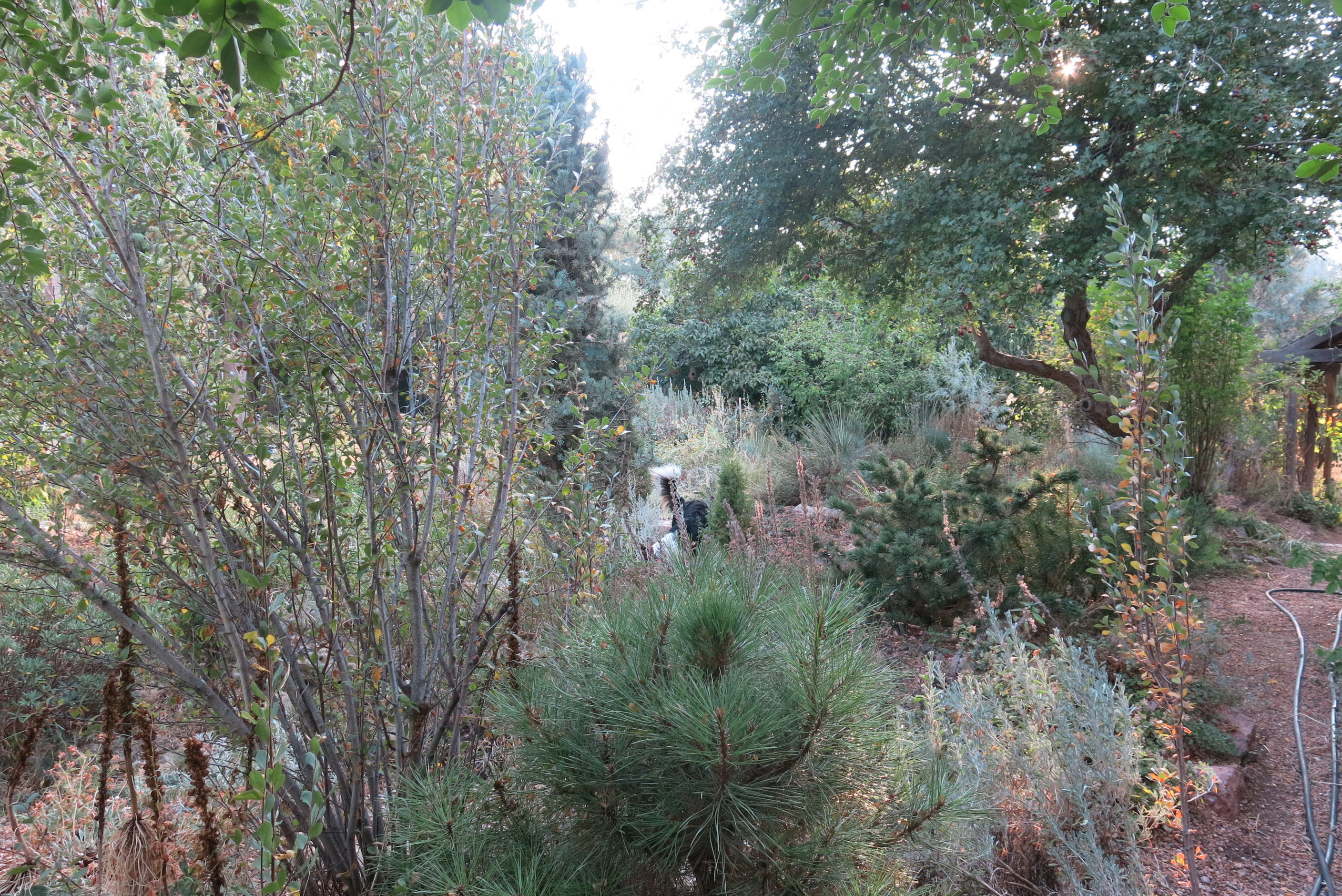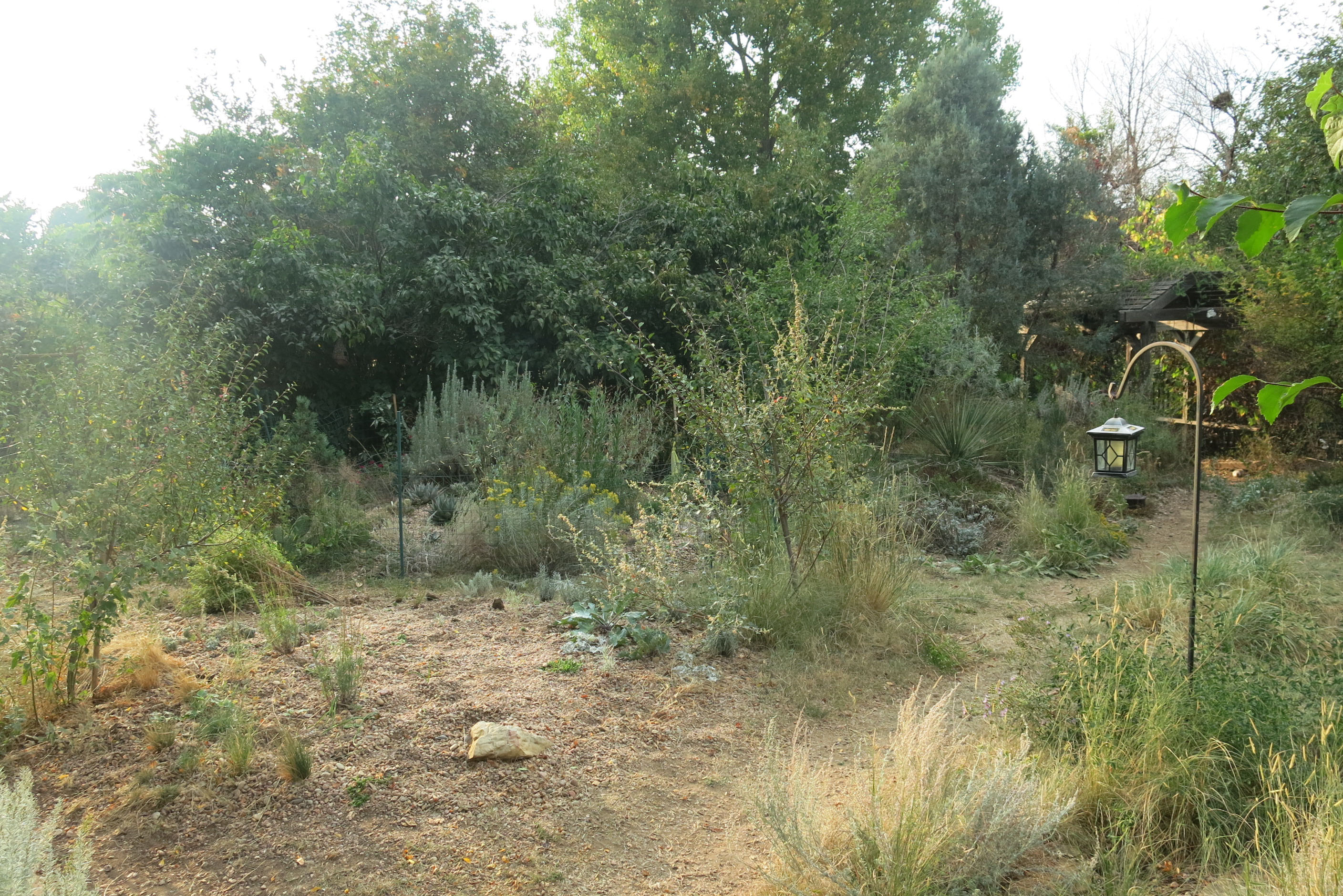 Thanks; the guy I live with sometimes fails in his resolve not to water, but so many plants have been added at the worst possible time (according to him) that watering becomes necessary. Now, mycorrhizae and phosphorous are not compatible at all. The guy I live with says there is only a tiny window of acceptable phosphorus levels for mycorrhizae to do their job; there’s stuff online about this. Most soils have mycorrhizae in them already. The asters flop here, too. One possible reason, here, is a lot of water when it rained every day, and then no water for months. It rained a tiny little bit today. Oh, also, there’s mycorrhizae information on the Las Pilitas website. The guy I live with is super put out by the fact that they won’t ship to Colorado any more, and maybe next spring he’ll call them and be extra cajoling, the way he can be with everyone but me. (I got into a huge amount of trouble today, twice, in fact. I got into the fenced garden with the agaves, and of course the reason I got into trouble wasn’t that I was wrecking stuff, but because of the agaves. There was a little snake in there. I didn’t pay any attention to the guy I live with until he tossed the plastic watering can into the bushes a few feet away from me.)